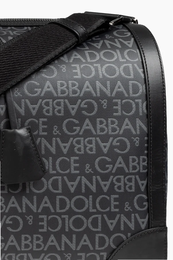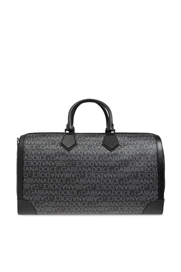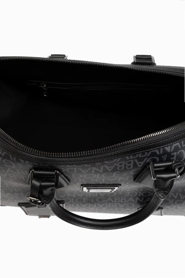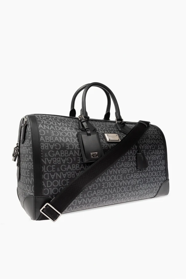 Designed for durability and elegance, the handbag includes two sturdy leather handles for hand-carrying and a detachable, adjustable shoulder strap for added convenience. The front is adorned with a metal plaque featuring the iconic "DOLCE & GABBANA" logo, and a luggage tag attached to one of the handles enhances its chic aesthetic.