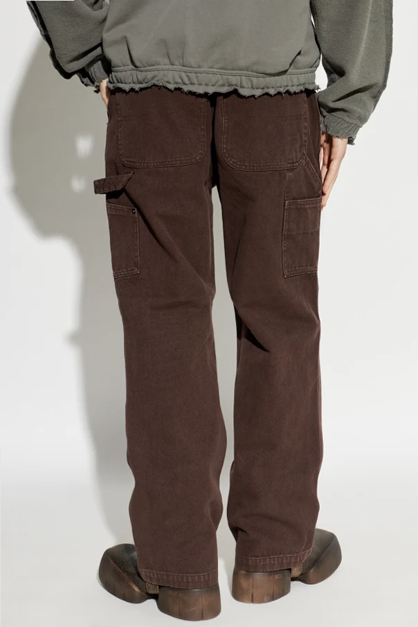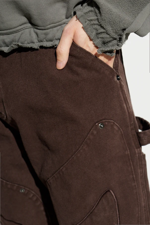 Distinctive, multilayered stitching and material panels on the front legs form sophisticated, geometric shapes, enhanced by contrasting trims and subtle decorative rivets. Functional details, including an additional coin pocket and an elegant side loop, nod gracefully to worker-inspired utility while elevating these jeans with understated exclusivity.