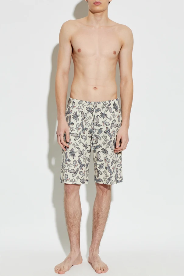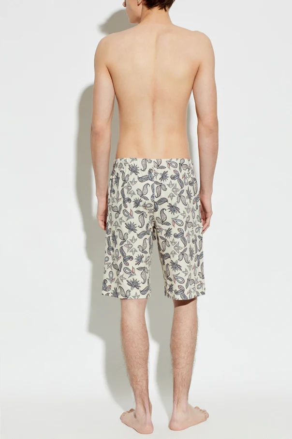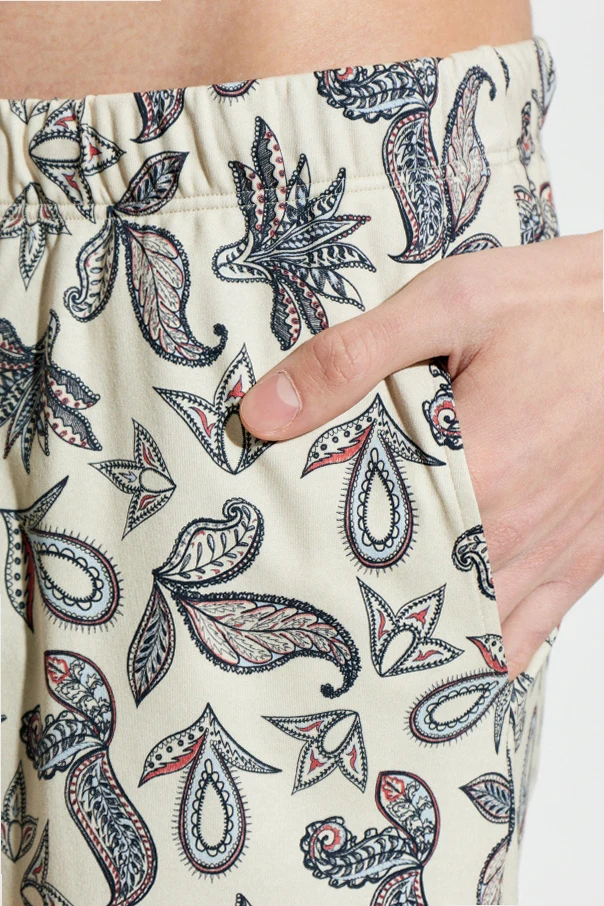 The surface is adorned with a striking paisley motif, interwoven with botanical and oriental accents that exude an air of timeless sophistication. An elastic waistband and streamlined legs ensure ease of movement, while discreet side pockets underscore both practicality and subtle elegance. The branding is elegantly understated, enhancing the minimalist aesthetic and emphasizing the shorts’ elevated character.