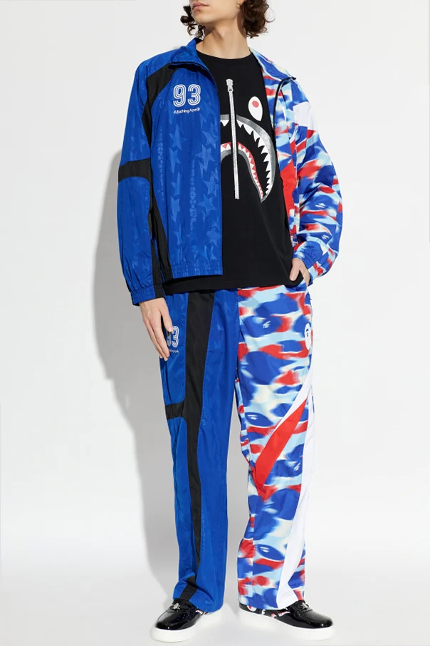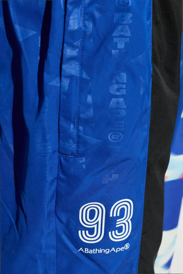 Meticulously crafted from a subtly lustrous technical fabric, these trousers boast a lightweight, wind-resistant quality, ensuring all-day comfort with a sport-inspired edge. Distinctive branding appears with a prominent “93” print and the iconic “A Bathing Ape®” logo, seamlessly woven into the blue patch for unmistakable authenticity.
