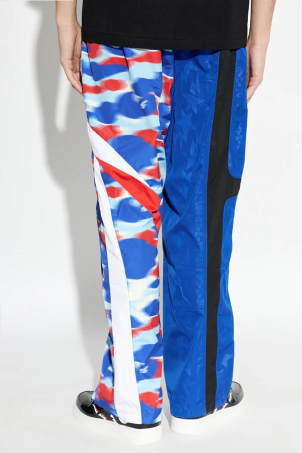 Elevate your elevated wardrobe with these multicolor patchwork trousers from A BATHING APE® , a statement of refined urban sophistication. These casual straight-leg pants seamlessly blend contemporary artistry with a classic, relaxed silhouette, rendered in a striking palette of blues, blacks, whites, and reds. The contrasting legs create a masterful visual interplay: one pays homage to minimalist design with its deep blue and black inserts, while the other features a vibrant camouflage motif energized by sharp, contrasting lines.