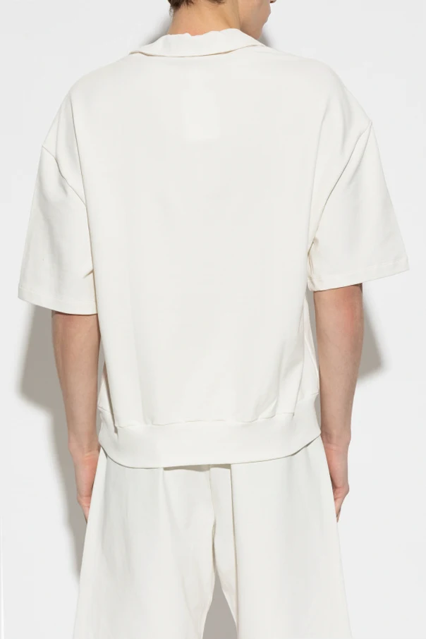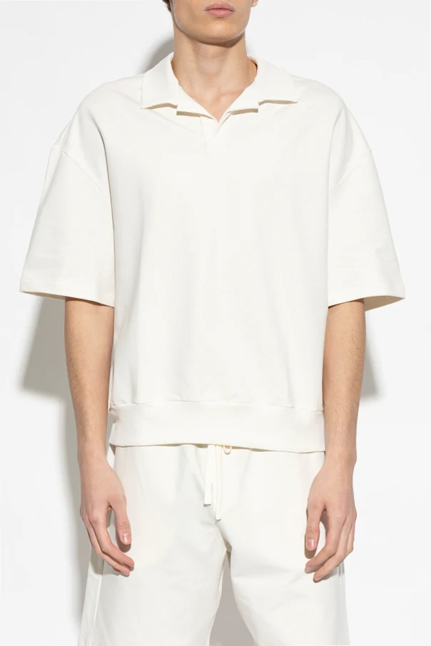 Discover refined ease with the Polo from the ‘Natural Living’ collection by Hanro, presented in an understated Ivory shade. This distinguished piece boasts a sleek, slightly oversized silhouette with dropped shoulders and wide, short sleeves, exuding a modern, sport-luxe aesthetic. The hem is finished with a wide, structured band, elegantly balancing relaxed comfort with sophisticated polish.