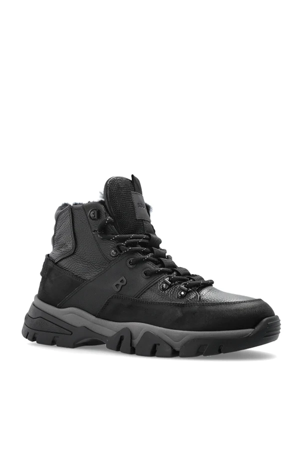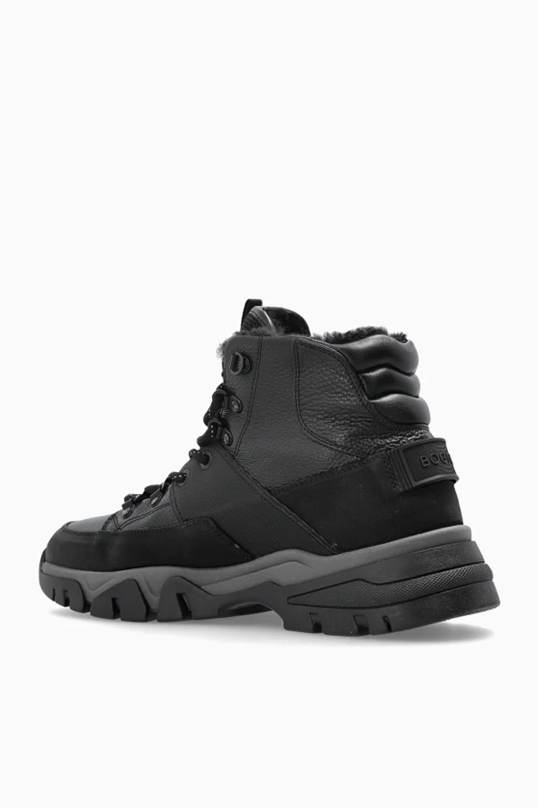 Experience refined resilience with the Bogner Mountain Ankle Boots , where exquisite craftsmanship meets utilitarian sophistication. Rendered in a bold black hue, these boots boast a robust silhouette rising above the ankle for unrivaled support and stability. The exterior is artfully crafted from premium, matte, slightly grained natural leather, accented by smooth leather and reinforced textile elements for enhanced durability and visual intrigue.