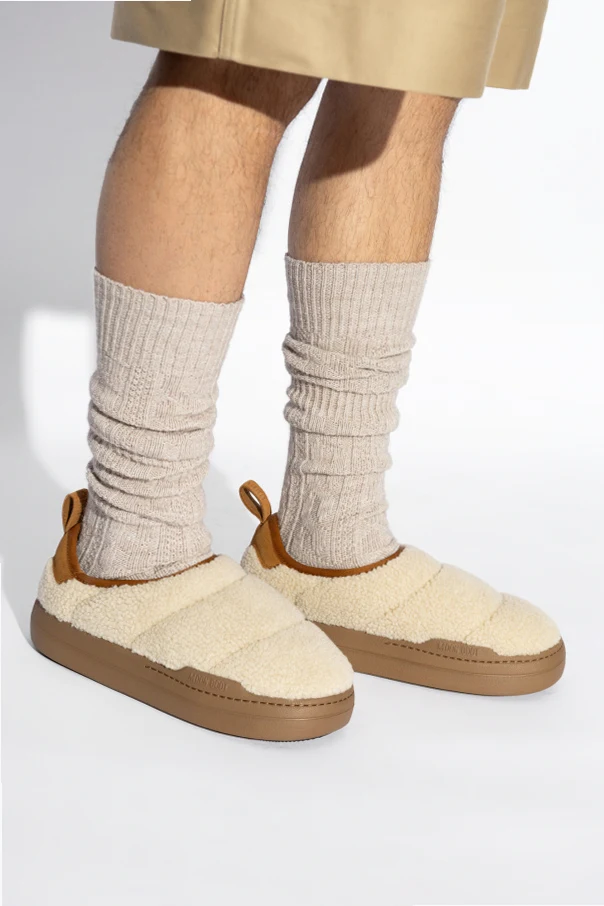 Featuring the iconic "Moon Boot" inscription on the outer sole and an easy-access loop on the back, these boots are as functional as they are fashionable. The interior is lined with a dark insole, complemented by a stylish imprint, ensuring both warmth and a touch of modern flair. Pair them with light-toned socks and a beige coat for a chic, casual ensemble that is both trendy and cozy.