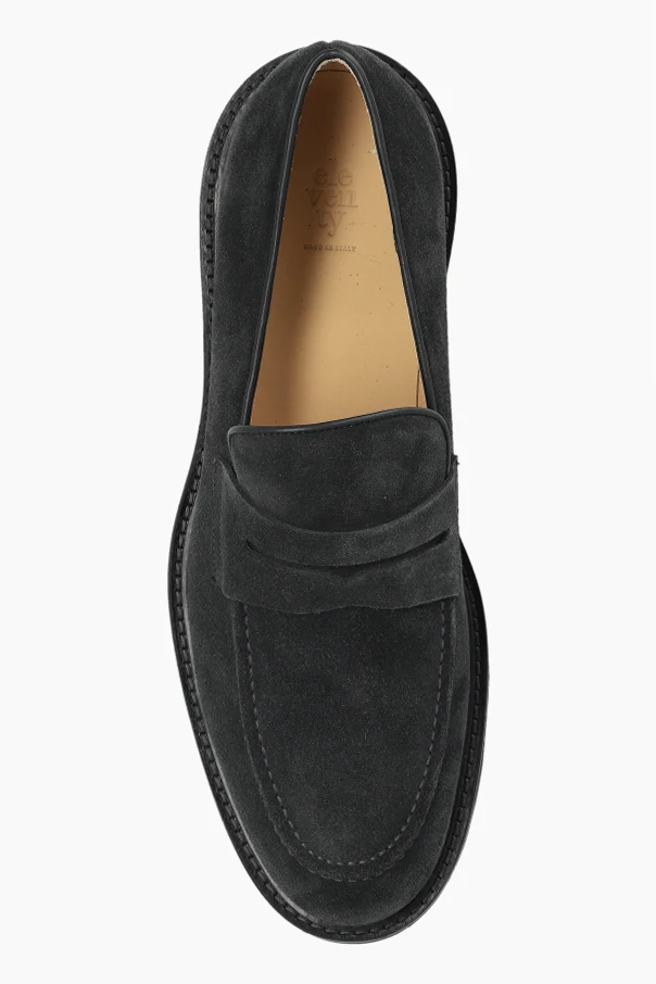 Impeccably crafted by Eleventy , these navy suede loafers exude understated sophistication. The sleek, elongated silhouette is devoid of laces for effortless elegance, while the matte, fine-textured suede displays the refined artistry of expertly sourced leather. Contrasting subtle stitching along the toe and edge lends a timeless, classic aesthetic.