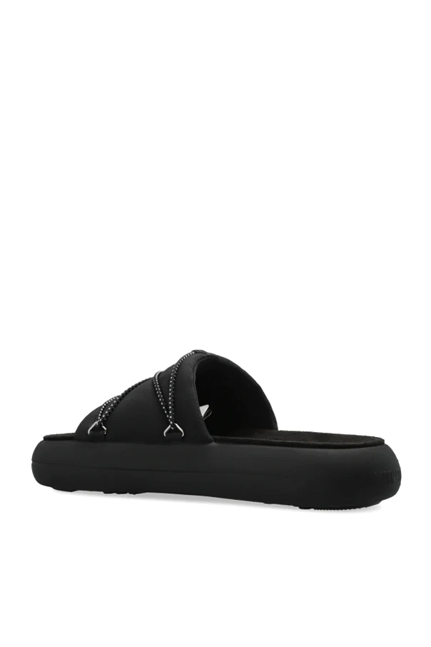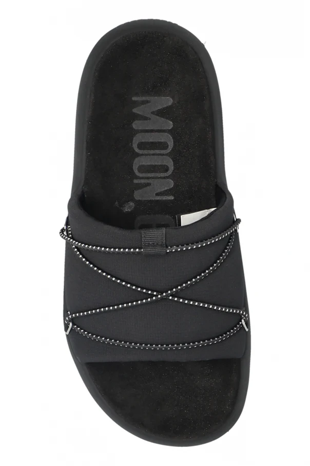 Crafted from premium matte technical textile, the upper exudes both softness and durability, while the interior is lined with an exceptionally plush material for a lavish wearing experience. The wide, comfort-first front strap is accentuated by striking black-and-white crisscross lacing threaded through metallic eyelets, a subtle yet distinctive hallmark of the Moon Boot legacy. The footbed features a bold embossed "MOON" logo, further attesting to their exclusivity.