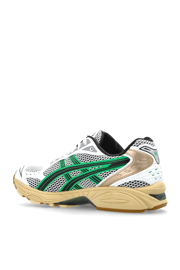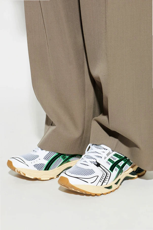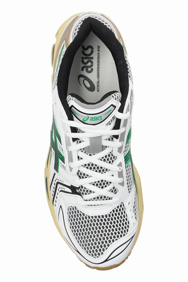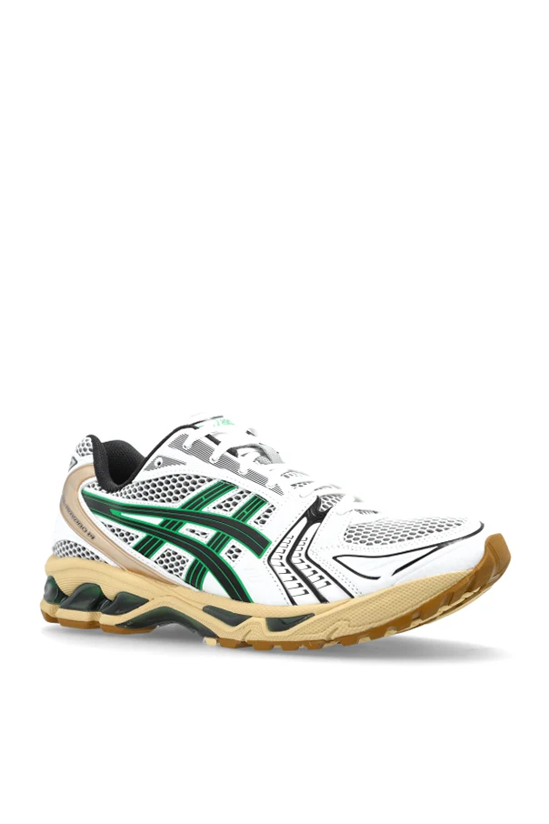 Exuding modern sophistication, the GEL-KAYANO 14 is a masterful low-top sneaker for men, thoughtfully designed by ASICS . Crafted with a predominantly white, breathable mesh upper, these sneakers deliver remarkable ventilation, while contrasting black and green synthetic overlays provide structural integrity and visual intrigue. Distinctive geometric panels, accentuated by dynamic stitching, are complemented by elegant beige and silver details at the heel, elevating the shoe’s refined allure.