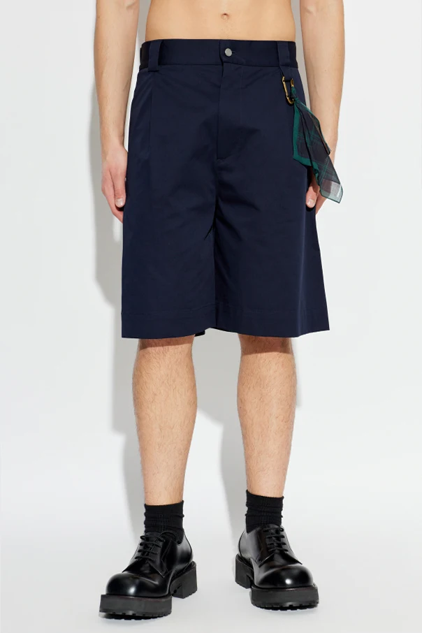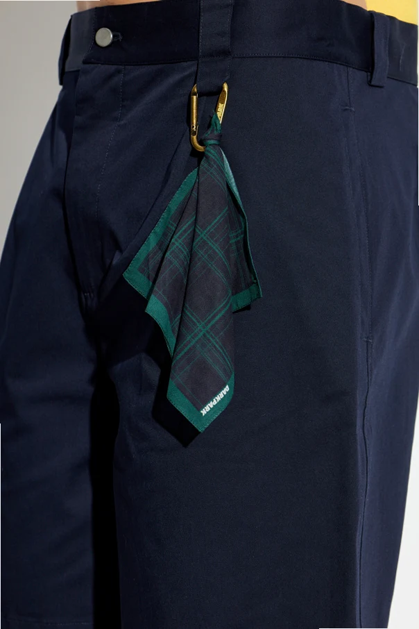 Distinct pressed creases and a relaxed fit evoke effortless charm, while functional accents—including wide belt loops , a classic button-and-zip closure, angular side pockets, and a single buttoned back pocket—elevate practicality. A standout detail, the dark green plaid scarf attached by a gleaming metal carabiner, imparts a unique signature to this minimalist design.