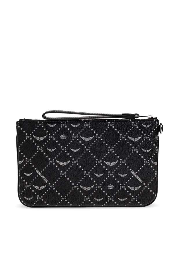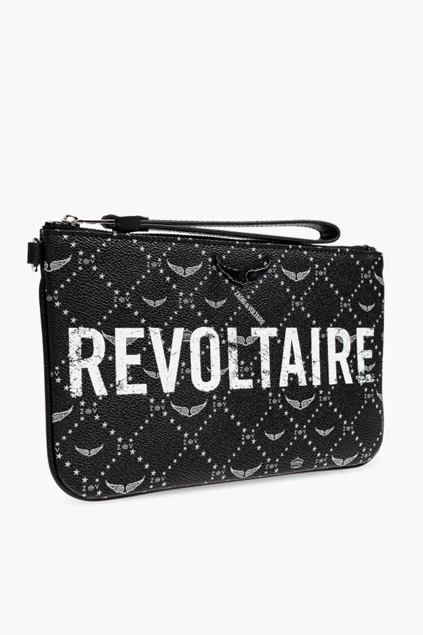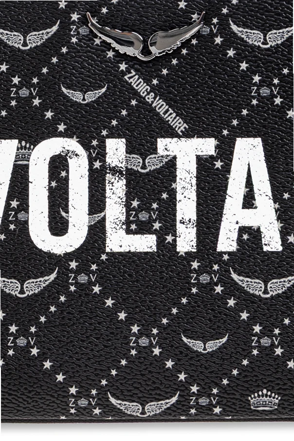 The surface is adorned with a distinctive, repetitive pattern: interwoven wings, stars, crowns, and the iconic “ZV” initials, forming a refined geometric lattice that captures the eye. At the forefront is a bold white REVOLTAIRE signature, crowned with a central metallic wing emblem—an unmistakable hallmark of Zadig & Voltaire. Subtle detailing is completed by a smaller designer logo, affirming its exclusive heritage.