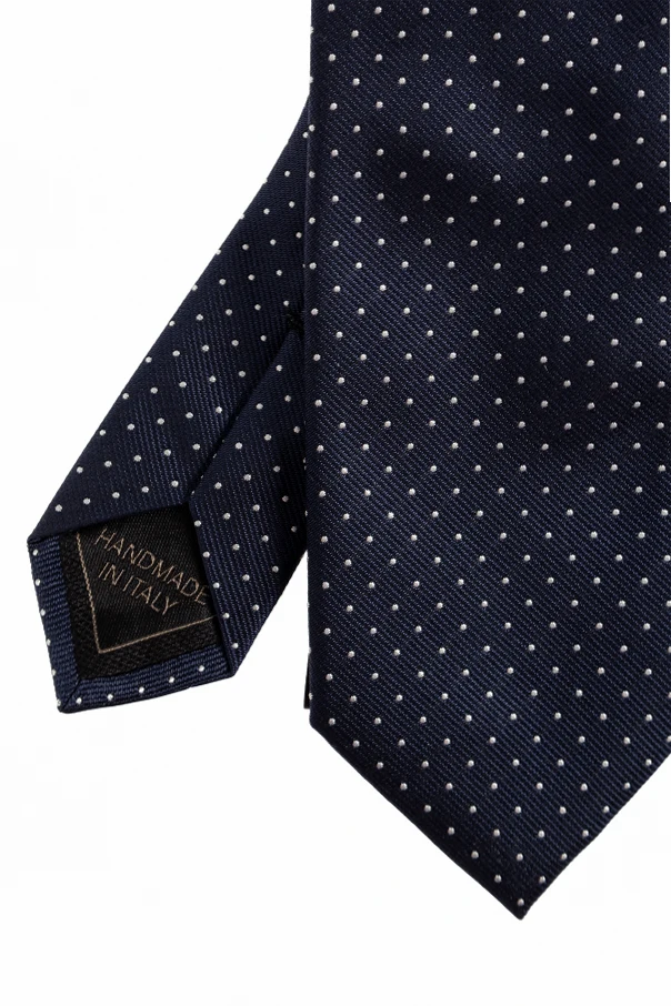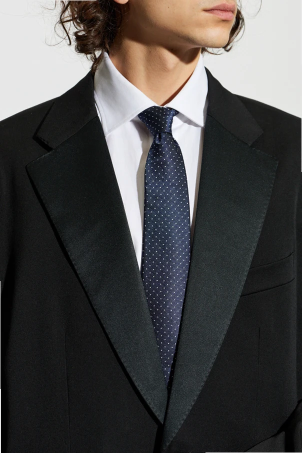 Elevate your ensemble with this Brioni Silk Tie , a masterfully crafted accessory epitomizing sophistication. Its classic silhouette —defined by a regular width and an elongated, pointed tip—exudes timeless elegance. The deep navy hue, enriched by a subtle sheen native to premium silk, is elegantly adorned with a refined pattern of evenly spaced white dots, lending an understated yet distinguished charm.