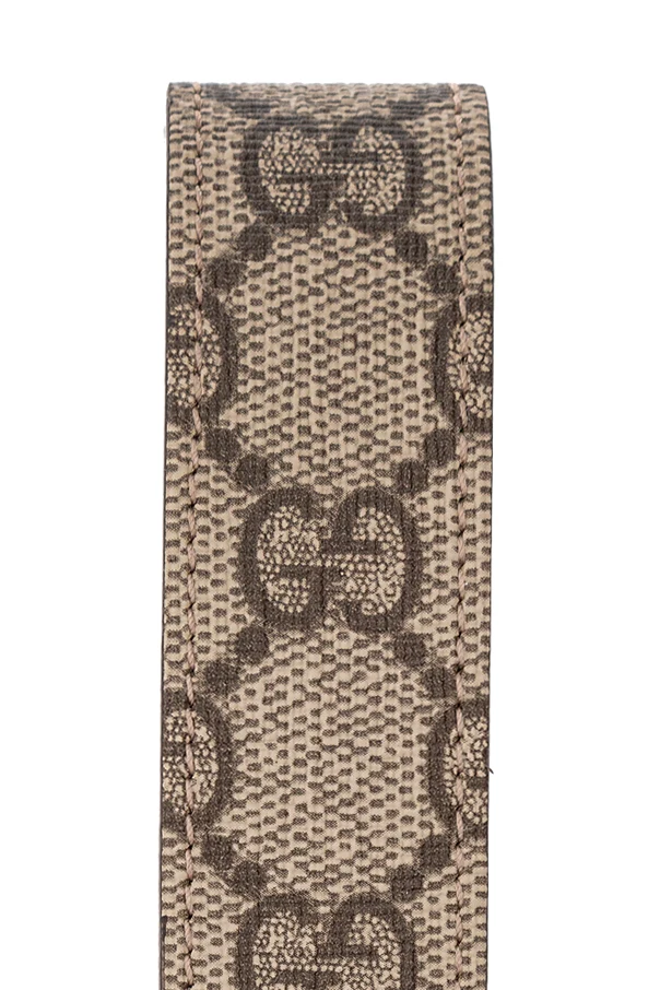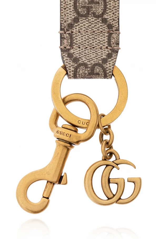Crafted from premium materials including canvas-like cotton, polyester, and polyurethane, this keychain is accentuated with gold-toned brass elements . The functional metal carabiner ensures seamless attachment of keys, while the signature double 'G' charms add a touch of elegance.