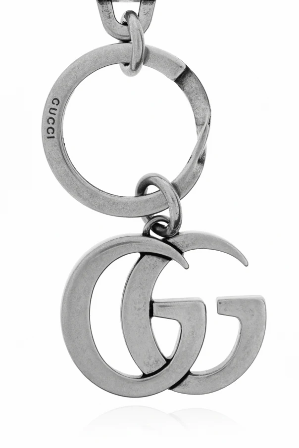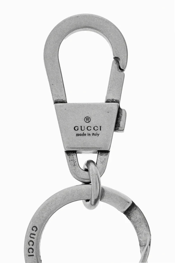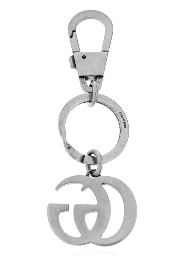 Introducing the Gucci Logo Keychain , an exquisite accessory that encapsulates the brand's signature luxury and innovation. Crafted from lustrous silver-toned metal, this keychain embodies the classic silhouette of a carabiner linked to a prominent round ring, adorned with the iconic double "G" emblem. The meticulously engraved brand logo and "made in Italy" inscription embellish the carabiner, underscoring its exclusive heritage.