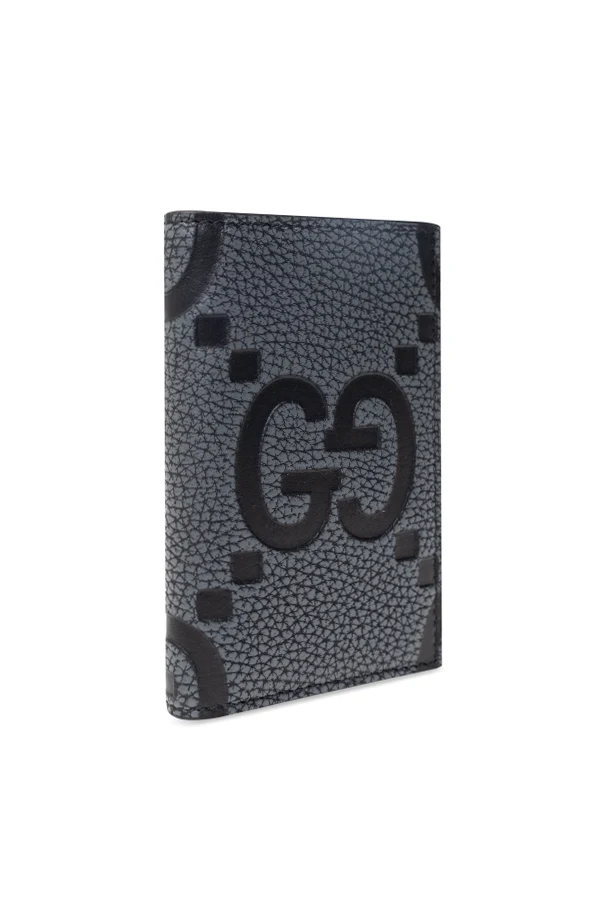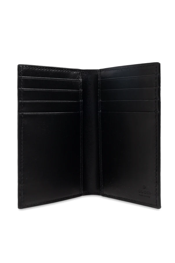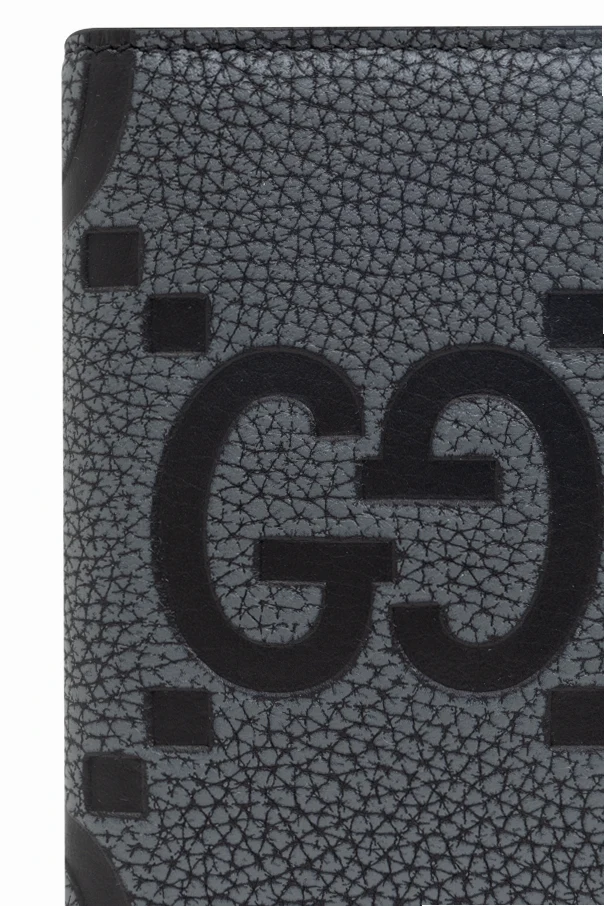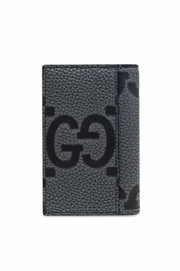 Introducing the Folding Card Case by Gucci , a sublime confluence of style and practicality. Crafted from exquisite leather, its classic rectangular form is adorned with a sophisticated gray hue, accentuated by a prominent black logo featuring the letter "G". This luxurious accessory is impeccably designed to cater to the discerning taste of modern sophisticates.