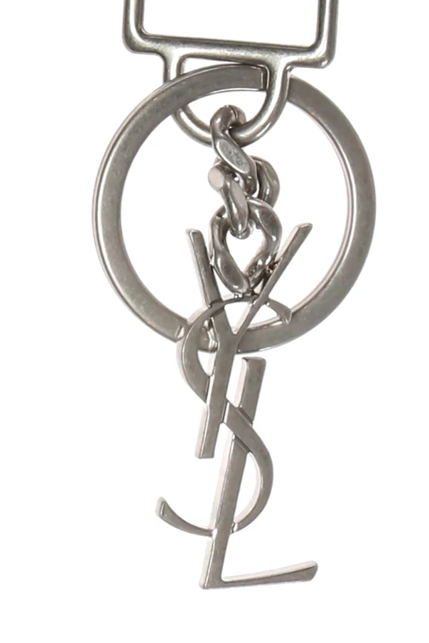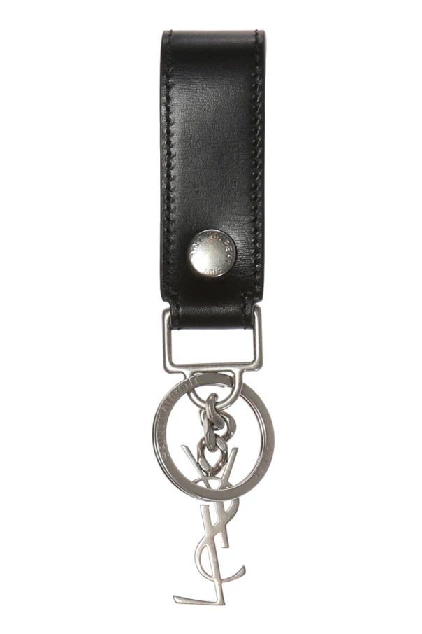 Black keyring from Saint Laurent. Decorated with a metal pendant including a logo and leather elements. Metal finished in silver.
