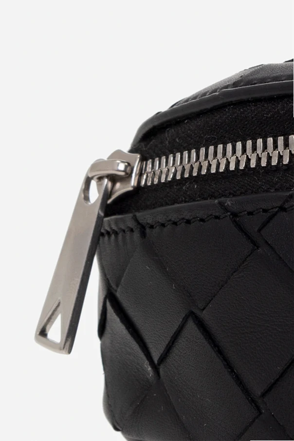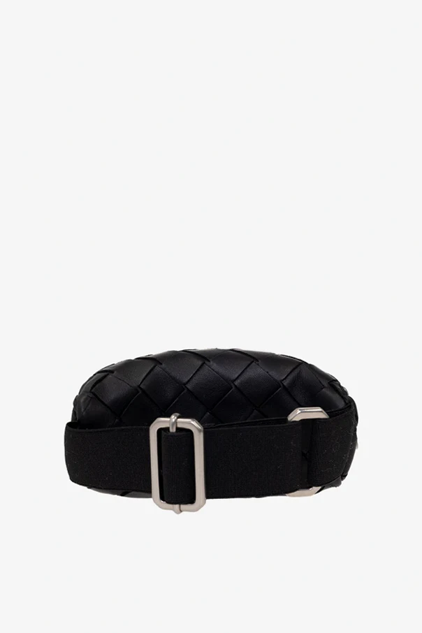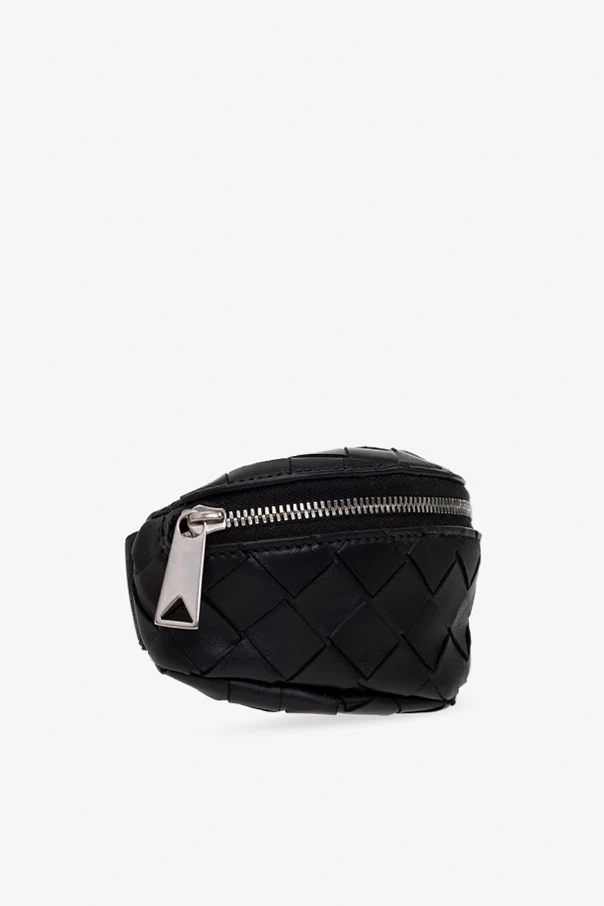 Black pouch from Bottega Veneta. Made of leather with the brand’s signature Intreccio weave, this item features a zip fastening, adjustable elastic strap, one internal compartment and silver-tone metal hardware.