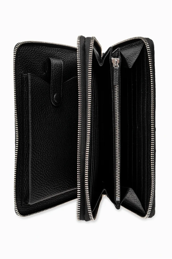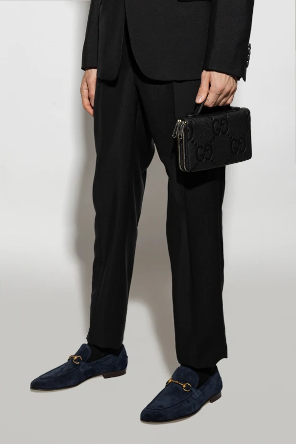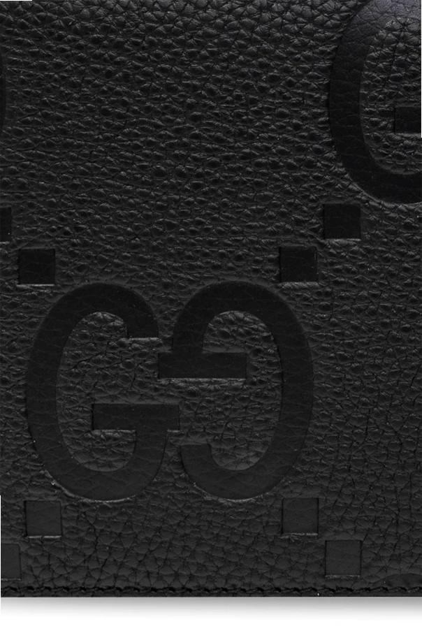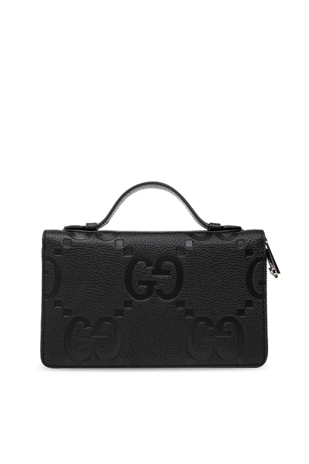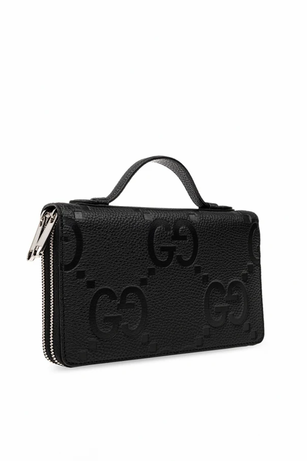 Black document case from Gucci. Made of leather with the iconic Jumbo GG pattern, this design features two separate internal compartments with zip-around fastening and silver-tone metal hardware. It has a snap-fastened coin pocket, two bill compartments, one zip pocket, five slip pockets and multiple card slots inside.