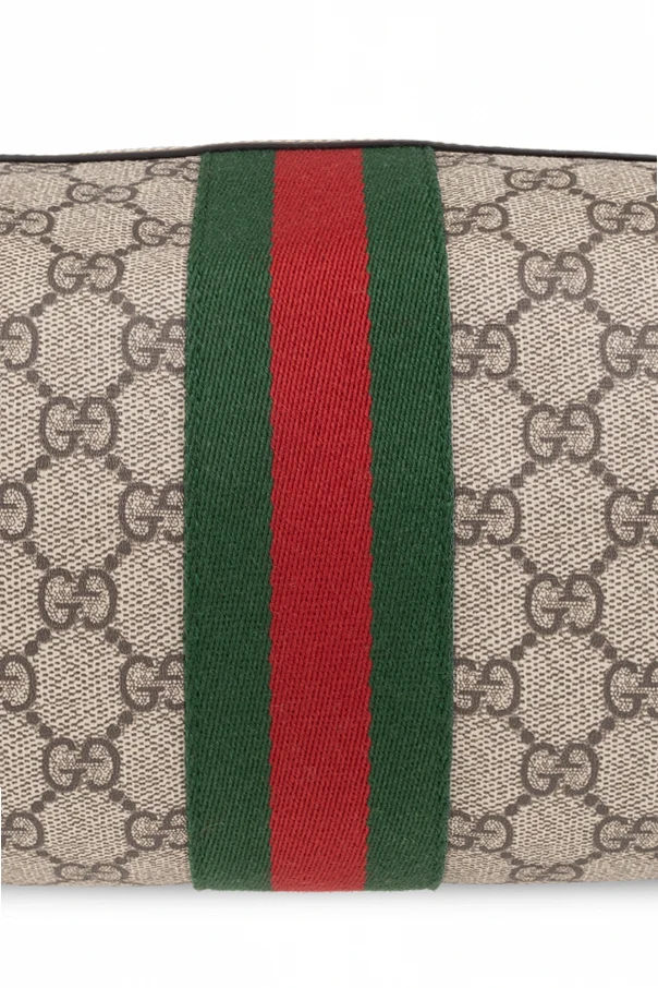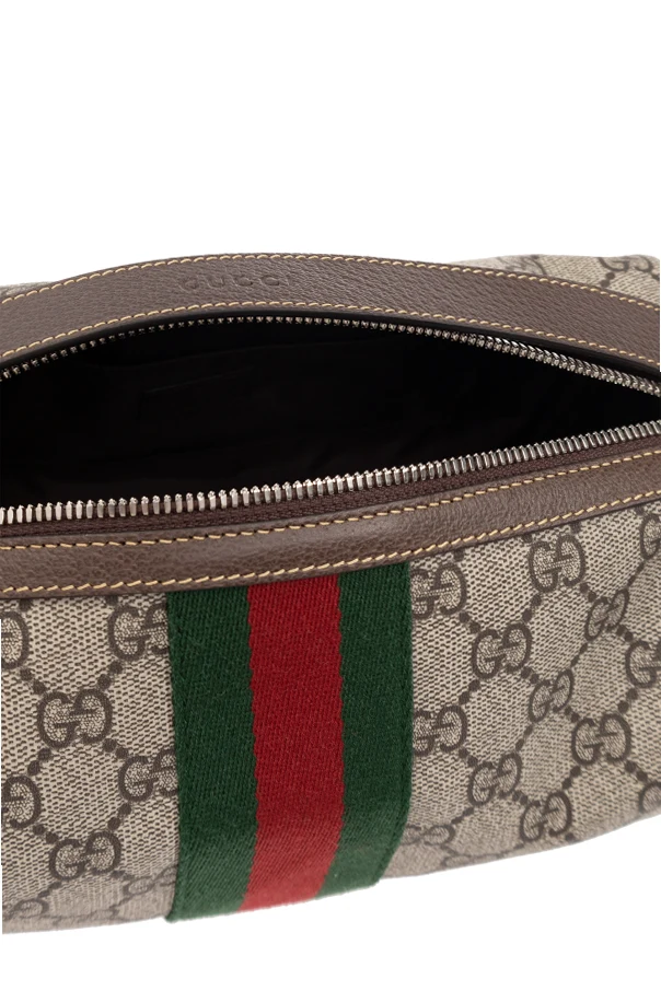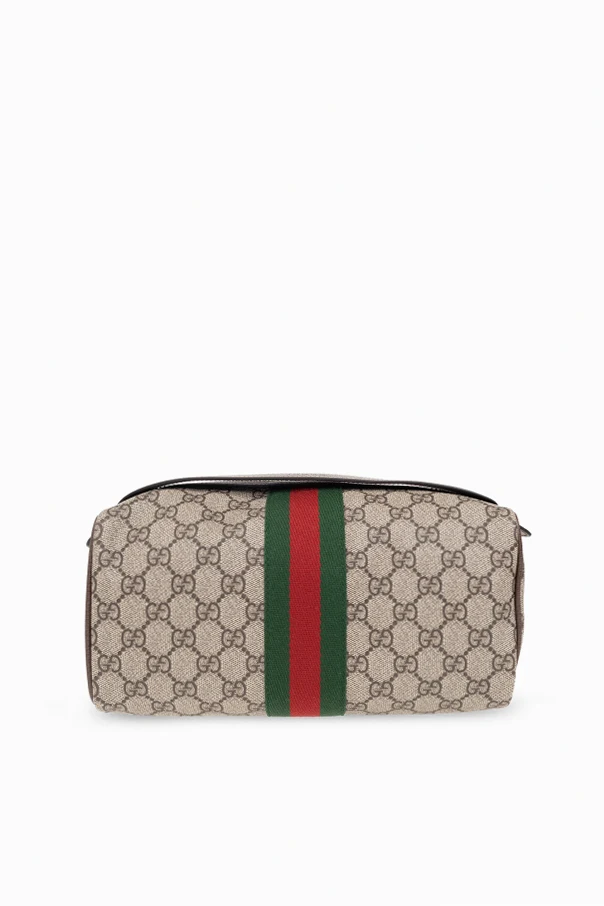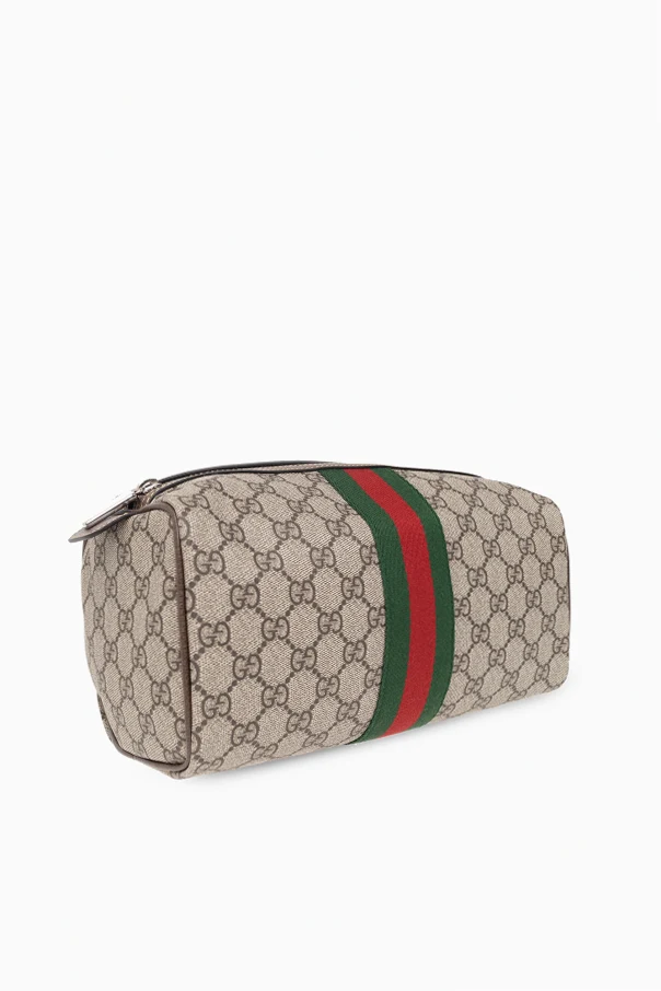 Beige and brown wash bag from Gucci. Made of ‘GG Supreme’ canvas trimmed with leather, this design features a zip fastening, the brand's signature green-red-green ‘Web’ stripe, embossed logo, half-round handle, one internal compartment and one slip pocket.
