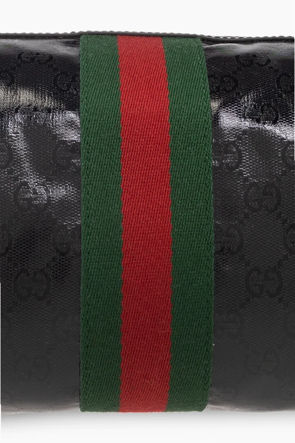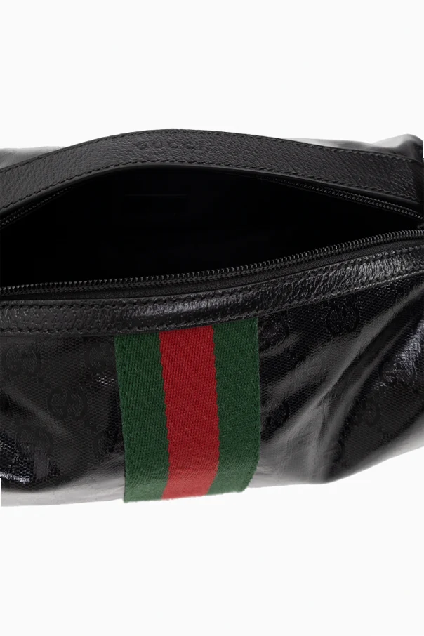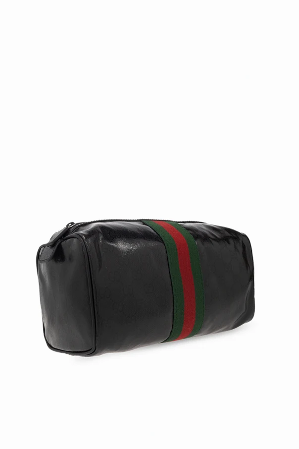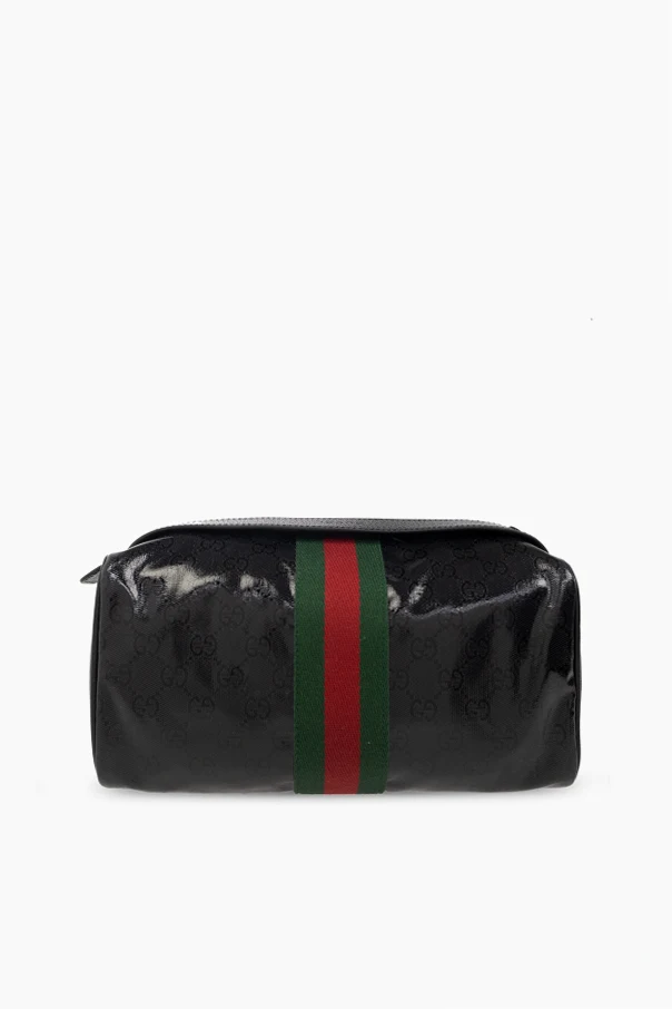 Black wash bag from Gucci. Made of ‘GG Crystal’ canvas trimmed with leather, this design features a zip fastening, the brand's signature green-red-green ‘Web’ stripe, embossed logo, half-round handle, one internal compartment and one slip pocket.
