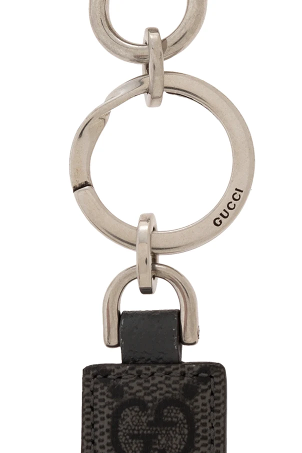 Notably, the silver-toned hardware adds a touch of refined elegance, with the carabiner and ring both displaying the exquisite craftsmanship expected of Gucci. A discreetly engraved logo on the ring further asserts its designer pedigree, making this key fob a must-have accessory for those who appreciate the finer things in life.