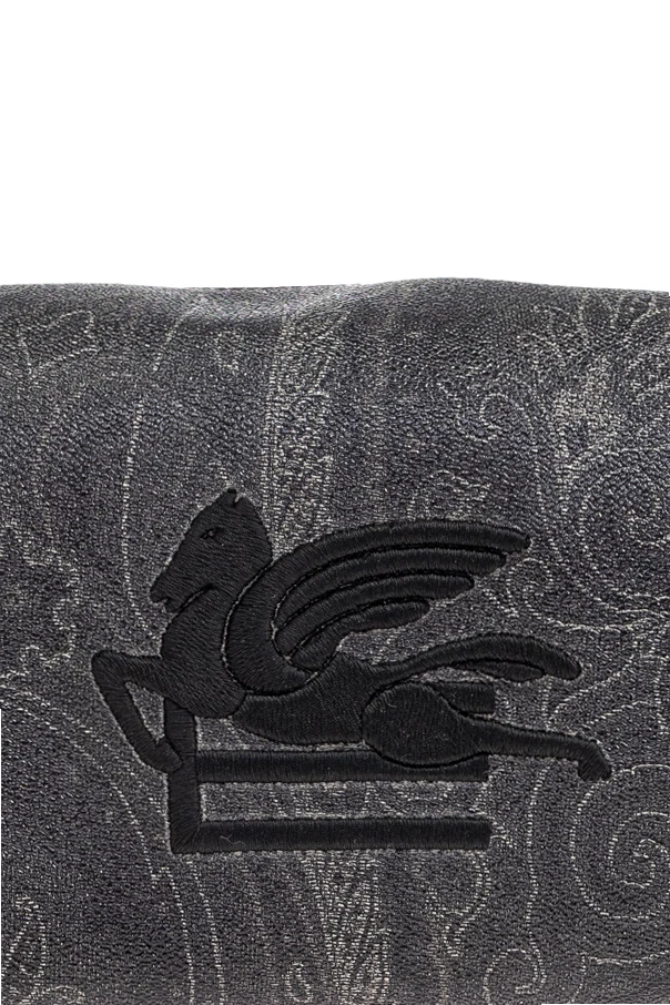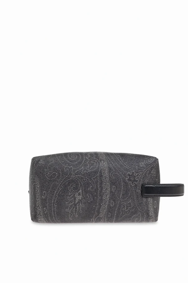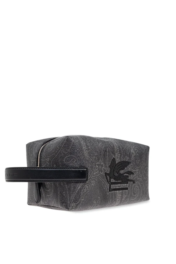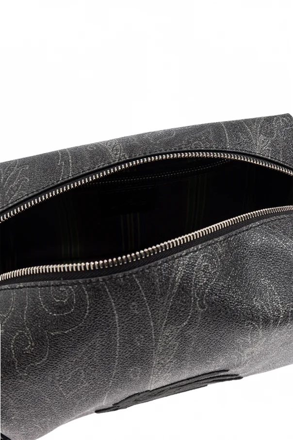 With a distinctive elongated rectangular silhouette, this black cosmetic case by Etro radiates understated luxury. The exterior is crafted from refined canvas featuring a subtle, tactile texture and entirely enveloped in an exquisite paisley motif—a hallmark of Etro’s signature style, inspired by the rich heritage of Asian artistry. A bold, expertly embroidered Pegasus logo ornamentally graces the front, offering a tangible matte finish that unmistakably signals sophistication.