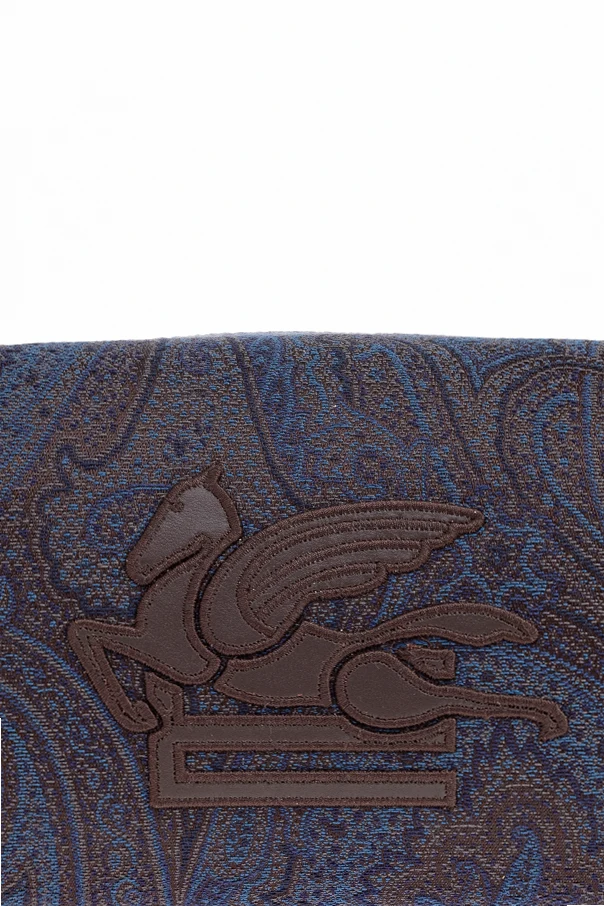 The opulent, paisley pattern—synonymous with Etro’s legacy and inspired by rich Asian artistry—graces the entire textile surface, reminiscent of luxurious jacquard or fine canvas. A tactile, embossed logo featuring the iconic winged horse adorns the front, rendered in supple leather for a striking 3D signature.