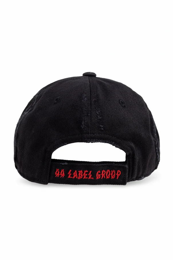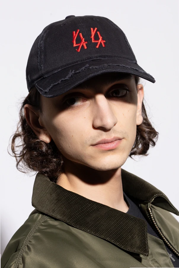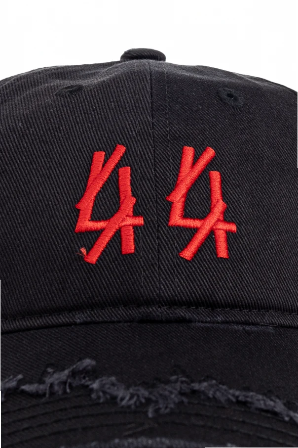 The vivid, embroidered red "44" logo on the front panel makes an unmistakable statement, its stylized figures alluding to raw urban creativity. The adjustable back strap ensures a tailored fit, while the cap's artisanal aged finishes add an exclusive flair, echoing the energy of the techno-inspired fashion scene.