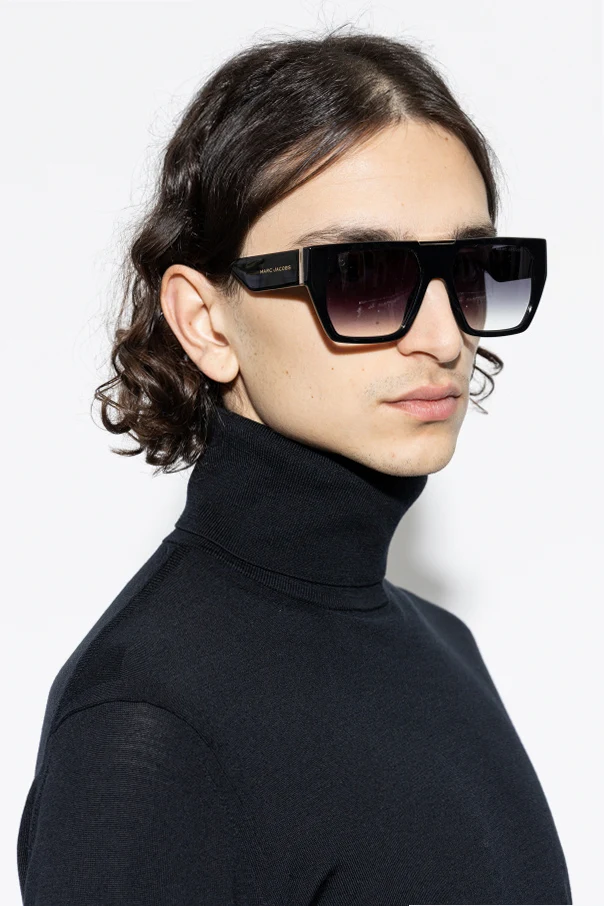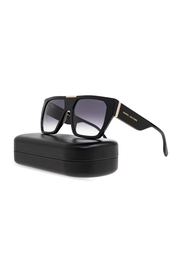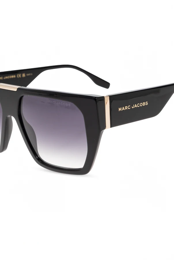 Distinctive gold metal accents at the hinge elegantly frame the temples, culminating in the iconic designer’s name, MAR C JACOBS , embossed in shimmering gold on the outer arms. The gradient lenses, shaded from deep ebony to a softer gray, promise both optimal eye protection and cosmopolitan allure. Minimalist yet unmistakably bold, these sunglasses embody Marc Jacobs' signature blend of haute couture inspiration and everyday sophistication.