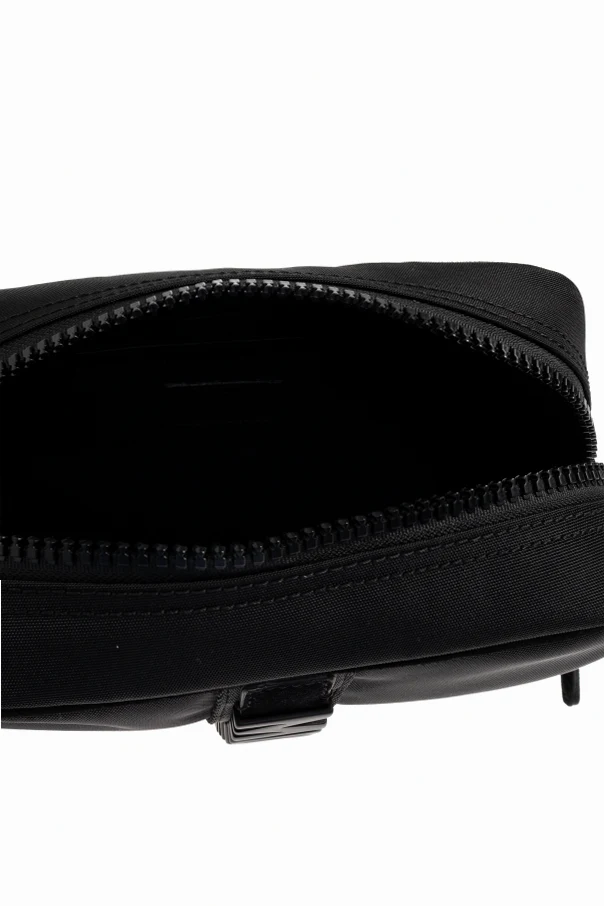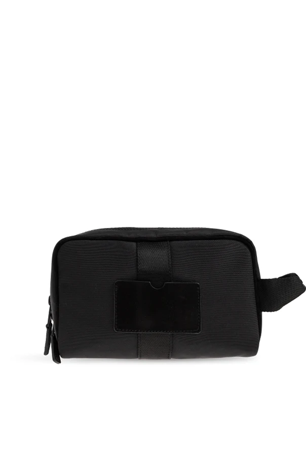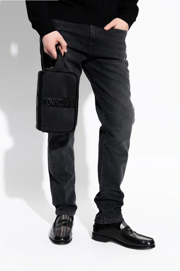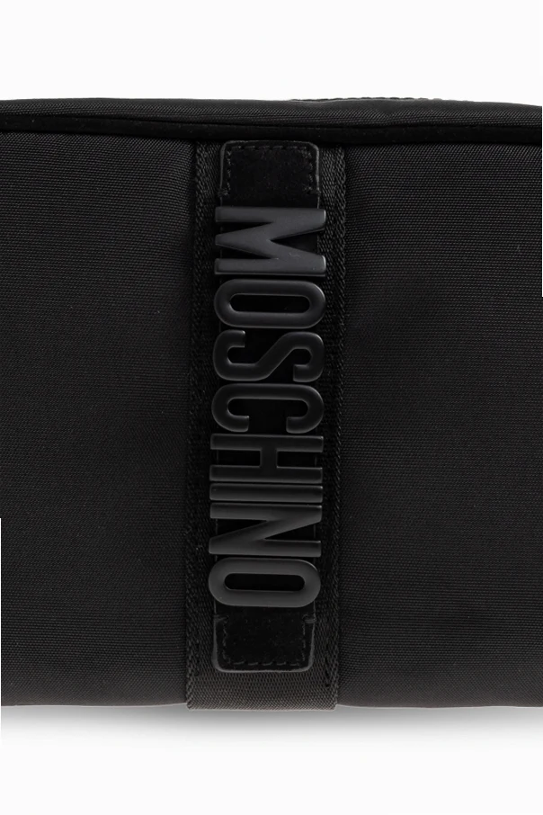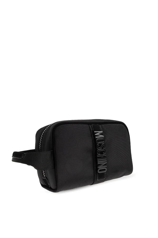 Discover refined utility with this rectangular black t echnical fabric toiletry bag by Moschino . Designed with a smooth, minimalist silhouette and a matte finish, it is expertly crafted from premium, slightly lustrous nylon or polyester, granting remarkable resistance to moisture and daily wear.