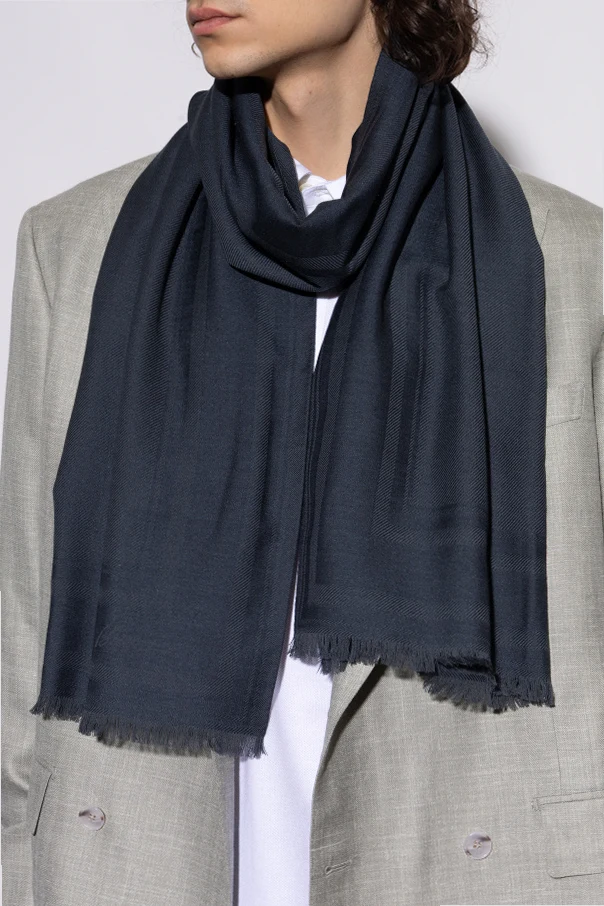 Impeccably refined, this navy scarf from Brioni exemplifies sophisticated minimalism with its timeless rectangular silhouette. Crafted from a premium blend of wool, cashmere, and silk, it offers an exceptionally smooth and airy hand while draping gracefully with understated elegance. Subtle textural striping, delicately woven into the fabric, creates a nuanced depth distinguished by a gentle luster with a whisper of satin sheen. Admirers of quiet luxury will appreciate the almost imperceptible designer signature, incorporated using a tonal jacquard technique, allowing the artistry of the material to shine.