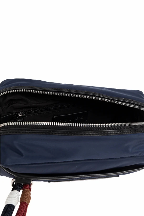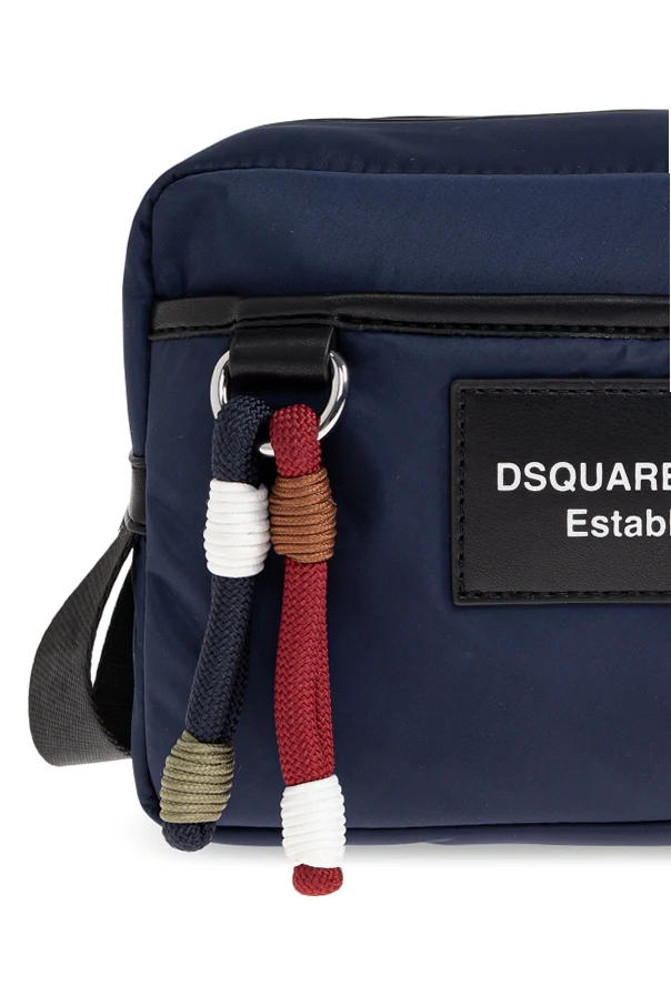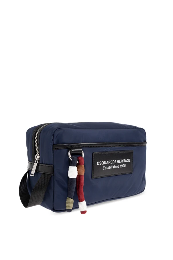 Distinct design elements set this accessory apart: a prominent rectangular patch with contrasting ivory text at the front boldly asserts the heritage of Dsquared2. Robust, oversized metal zippers and intricately colored decorative cords—featuring navy, red, olive, and white—grace the front, infusing each gesture with understated sophistication.