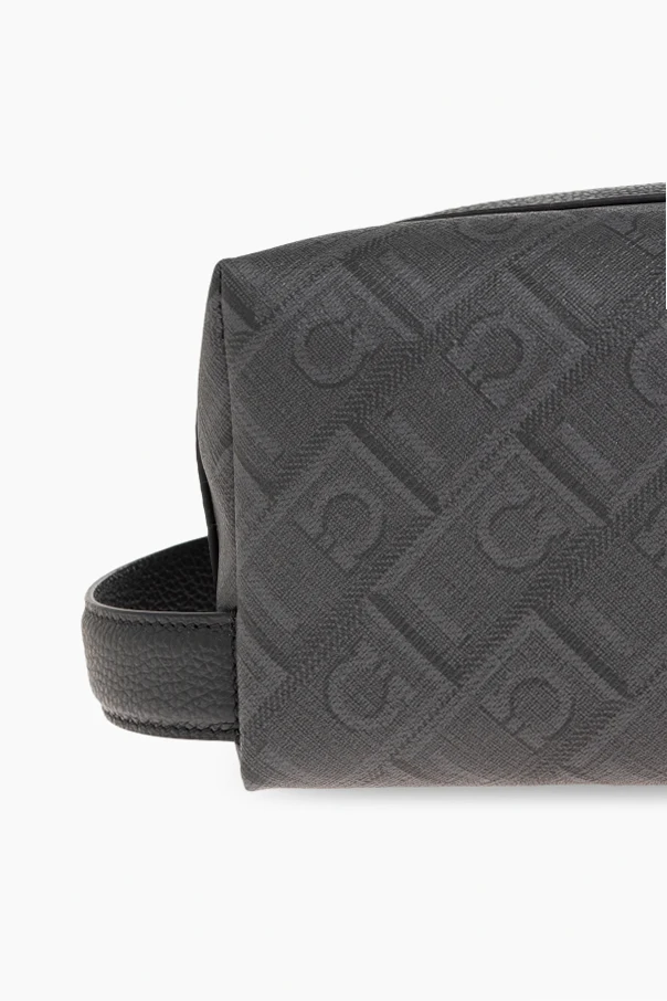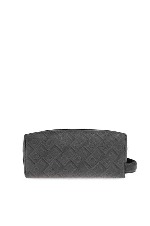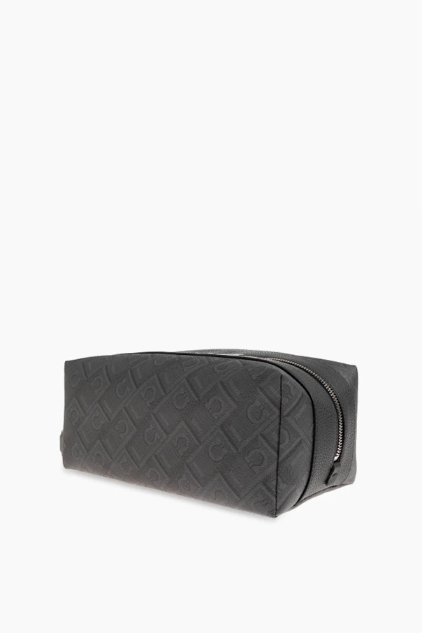 Discover unparalleled sophistication with this rectangular monogram turtleneck pouch from FERRAGAMO . Expertly crafted from premium leather and refined canvas, its distinct granulated texture and geometric embossed motif epitomize modern luxury . The pouch’s matte gray finish exudes timeless elegance, while meticulously defined edges and a broad base ensure stately presence and stability when set down.
