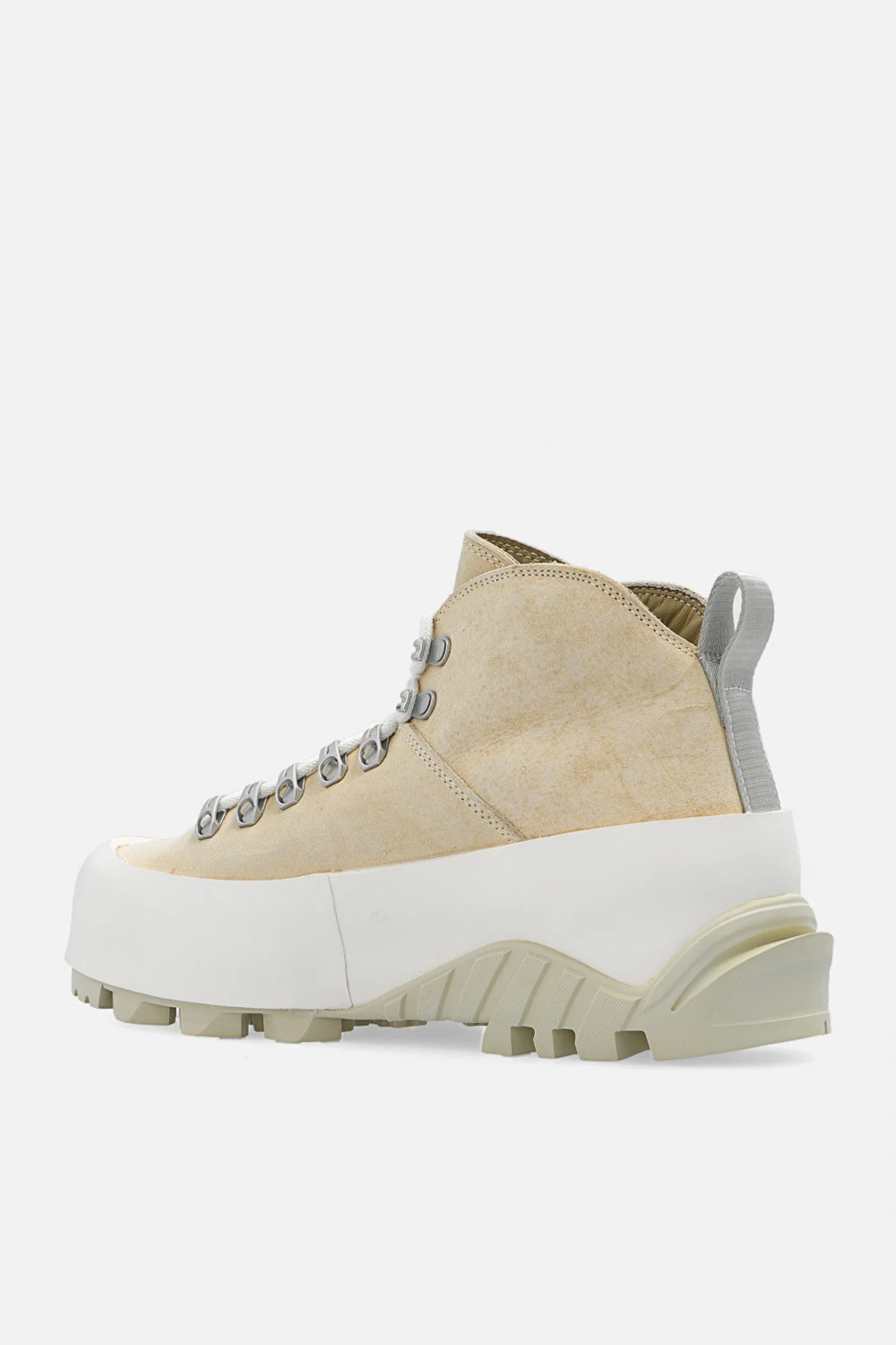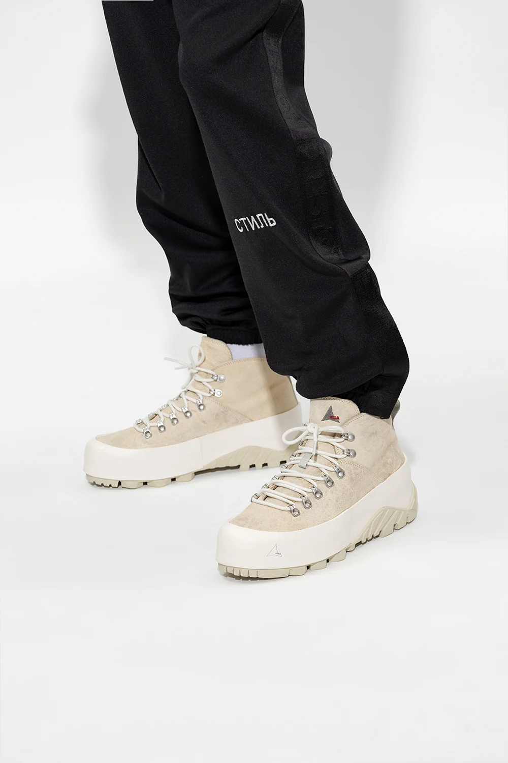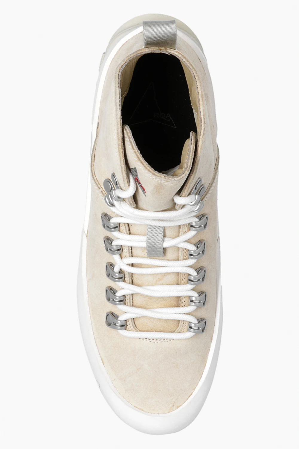 Cream ‘CVO’ hiking boots from ROA. Crafted from leather with a vintage effect and trimmed with rubber, this lace-up model features a logo-embroidered tongue, a logo printed on the side, a grey pull tab at the back and a cream and white Vibram Megagrip toothed tread pattern sole designed for optimal traction and to ensure high resistance to use on roughest surfaces. Swappable black laces included.