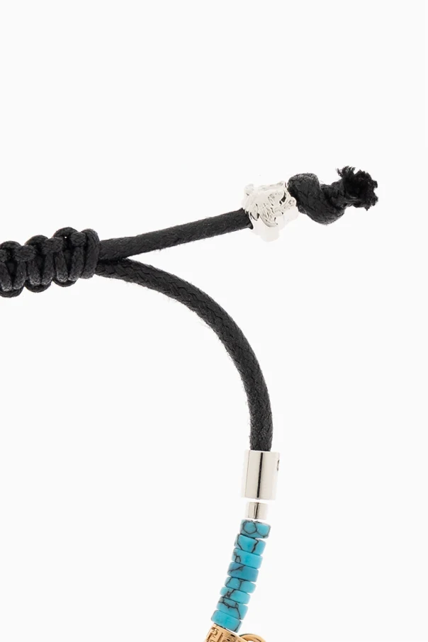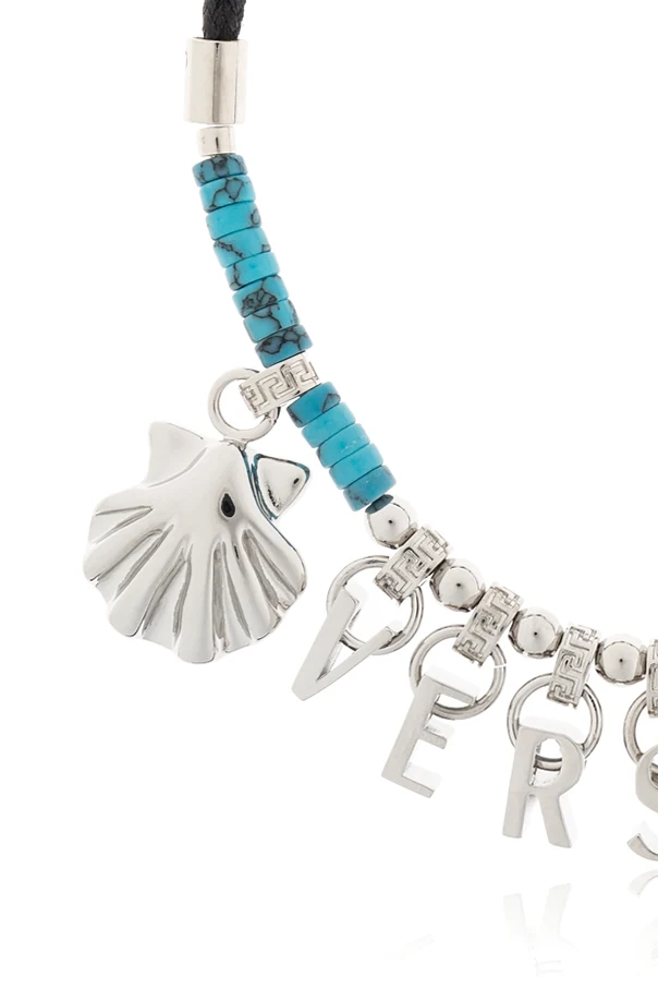 Engage with the epitome of artistry with the exquisite Bracelet with Charms by Versace. Elegantly fashioned from a black cord, this bracelet marries the lustrous allure of metal with the vibrant hue of blue beads, creating a harmonious symphony of form and color.