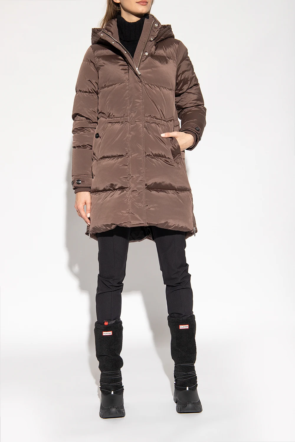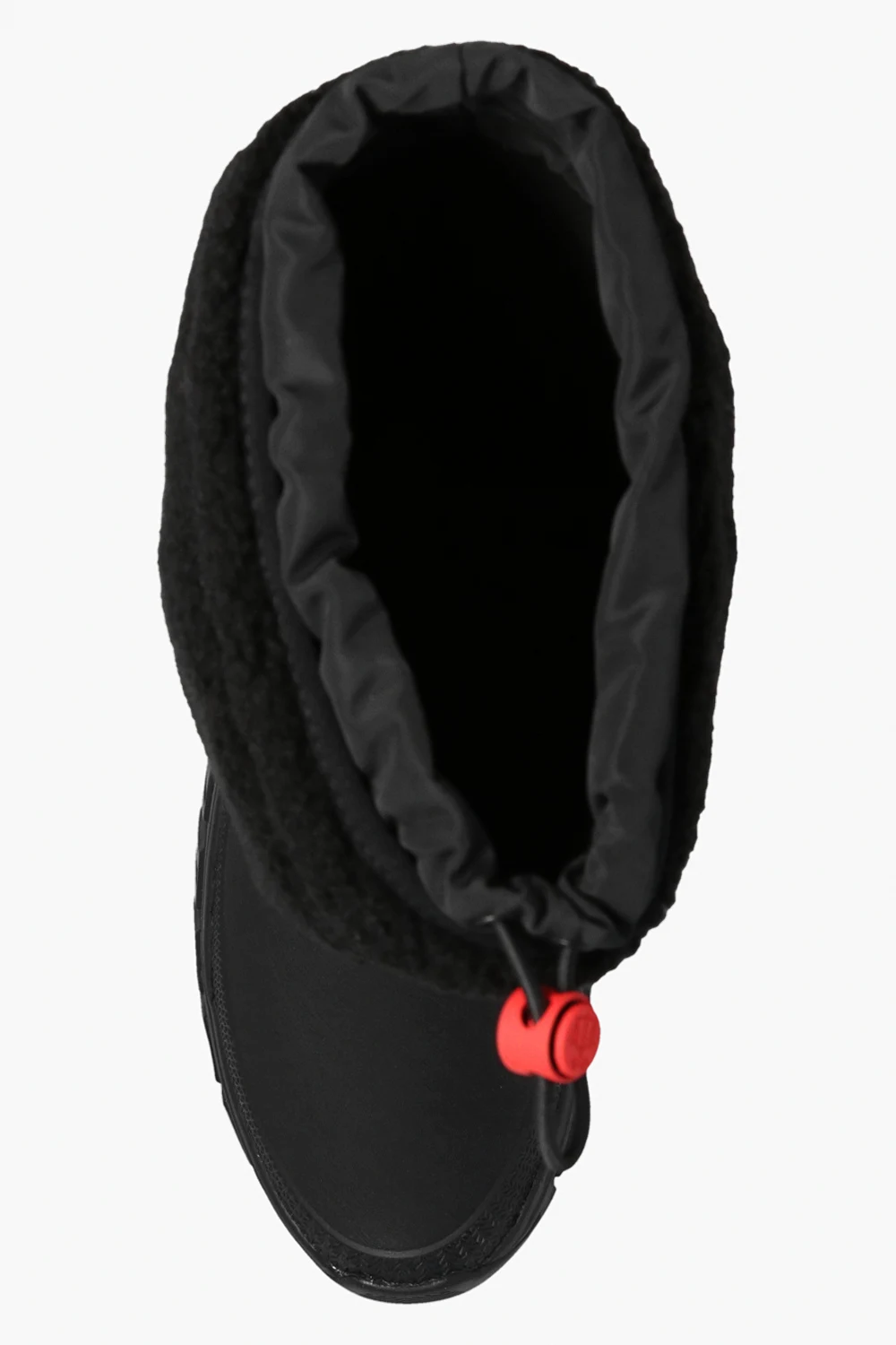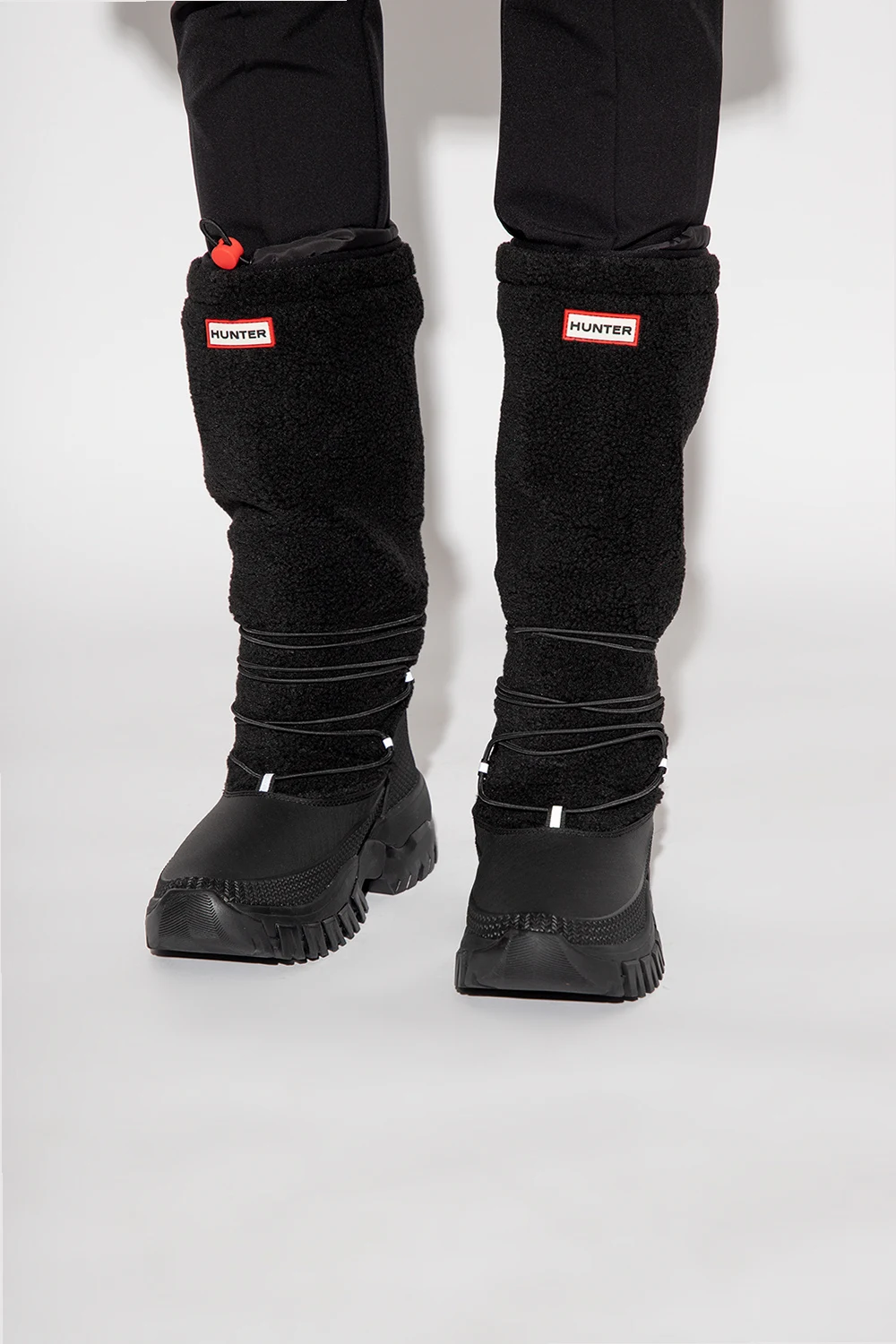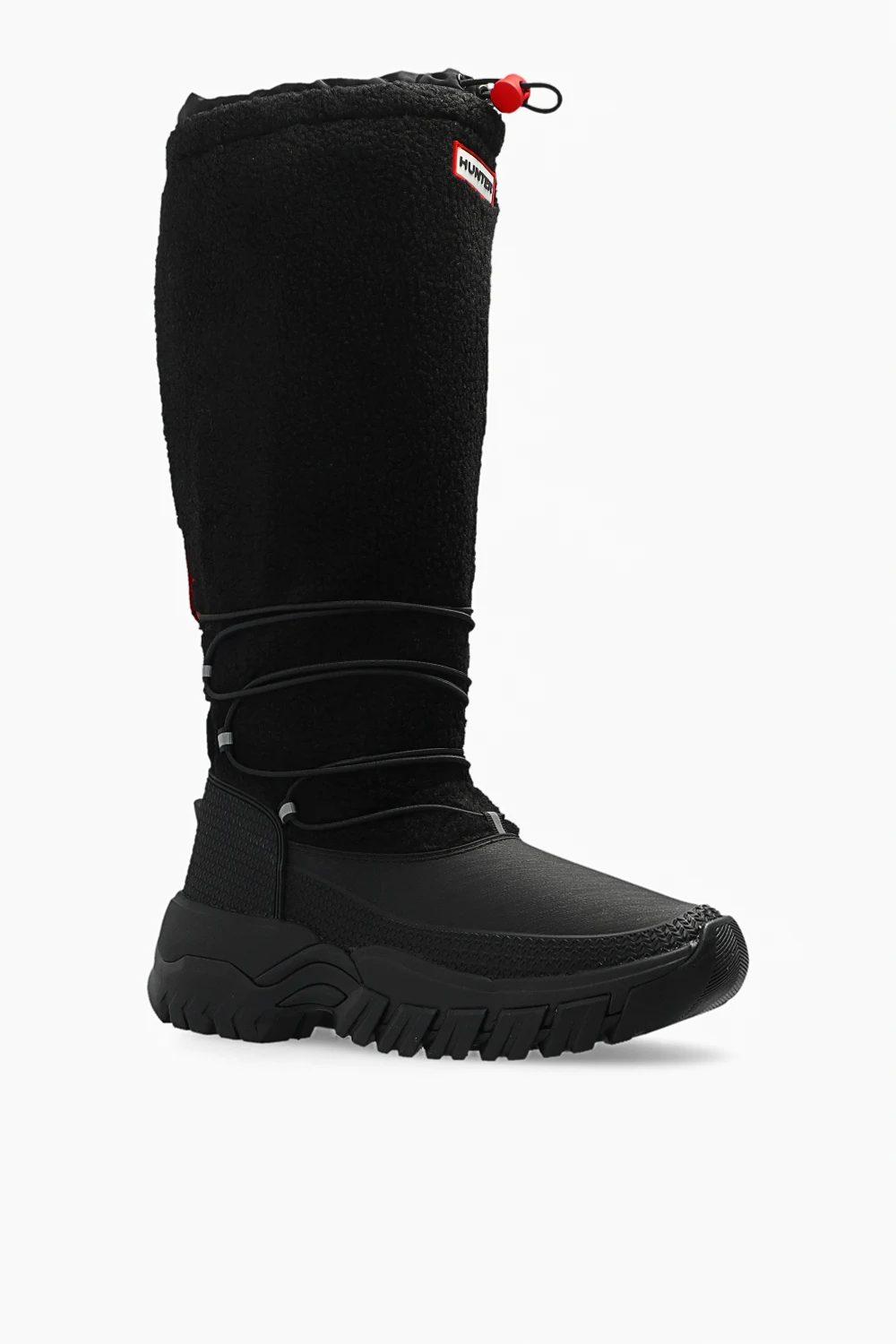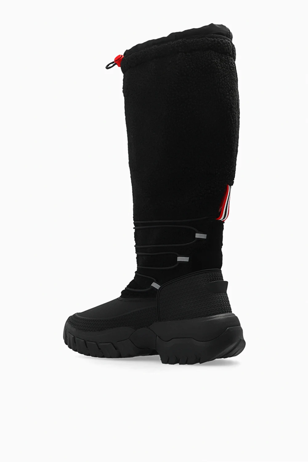 Black ‘Wanderer’ snow boots from Hunter. Crafted using Natural Rubber From Forests Independently Audited To Forest Stewardship Council® Standards. With a cosy vegan shearling upper and recycled fleece lining, it’s rated to withstand temperatures as low as -25°C (-13°F). The elasticated drawstring and toggle along the topline retain warmth while the grippy rubber soles and supportive OrthoLite® footbeds mean you can trek through cold climes with confidence and in comfort.
