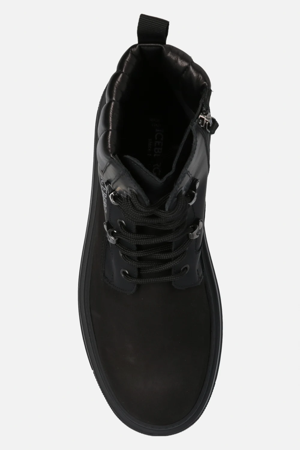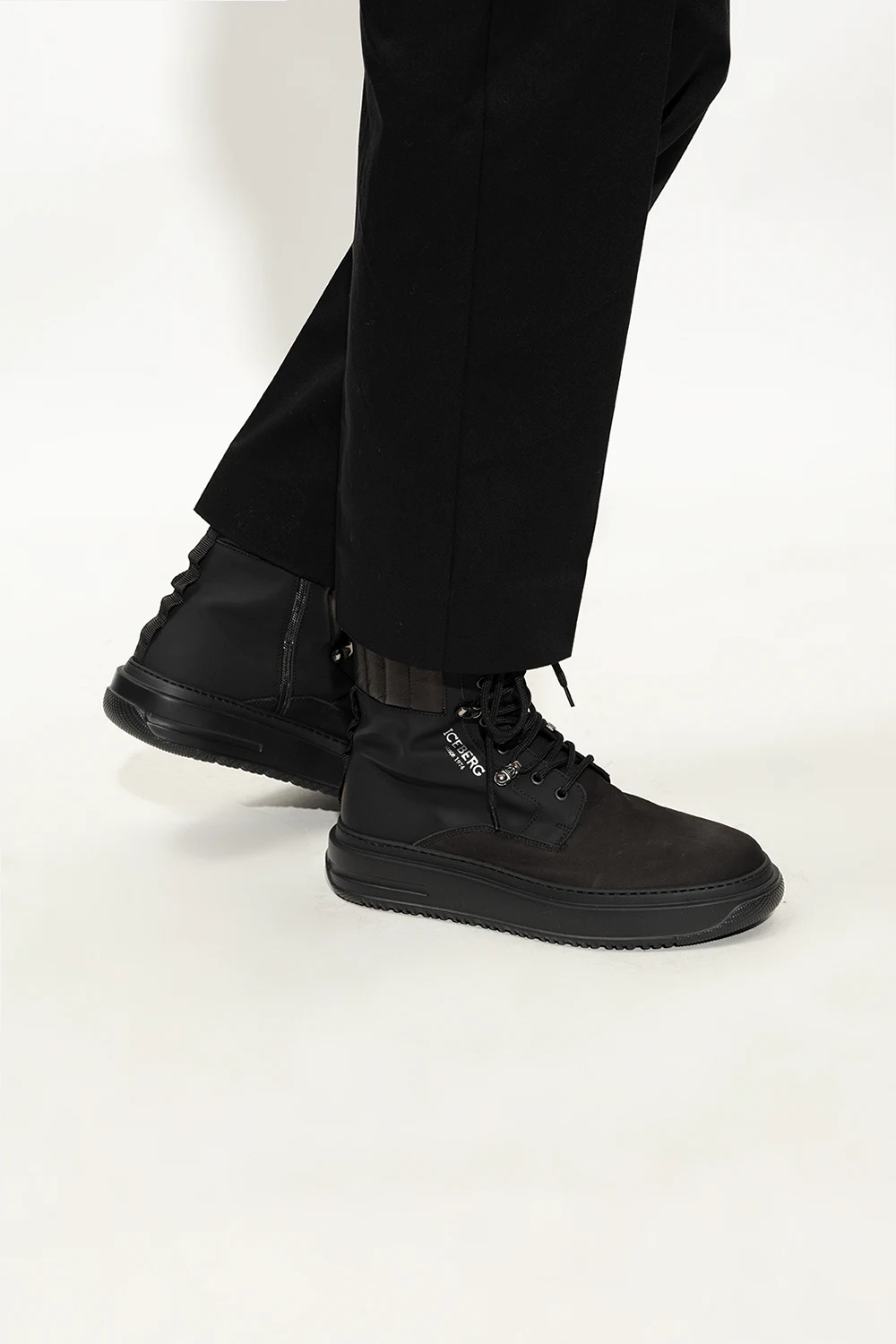 Black ankle boots from Iceberg. Crafted from leather, this lace-up model sits on a black rubber sole and features a side zipper and a silver-tone logo print.