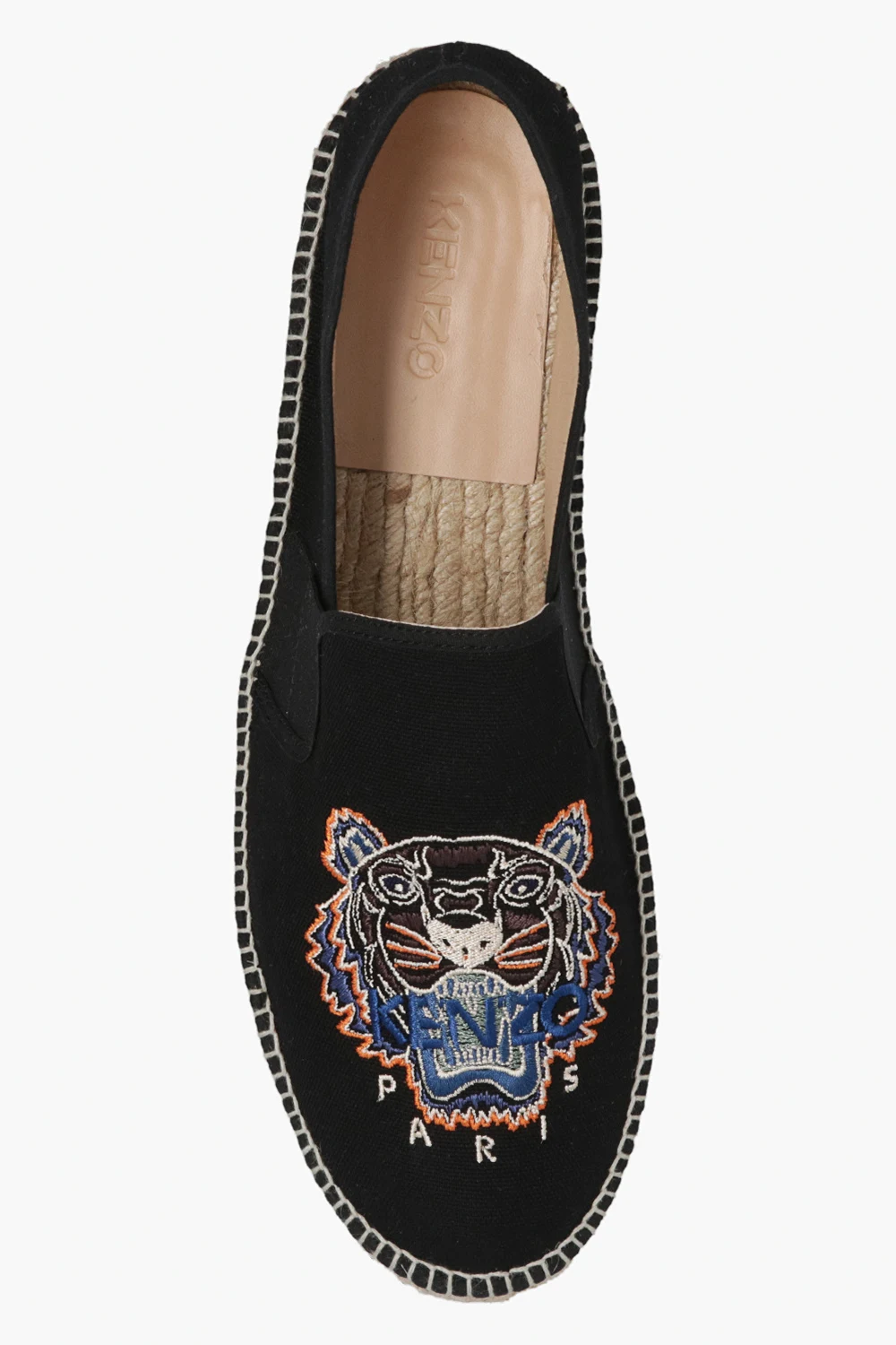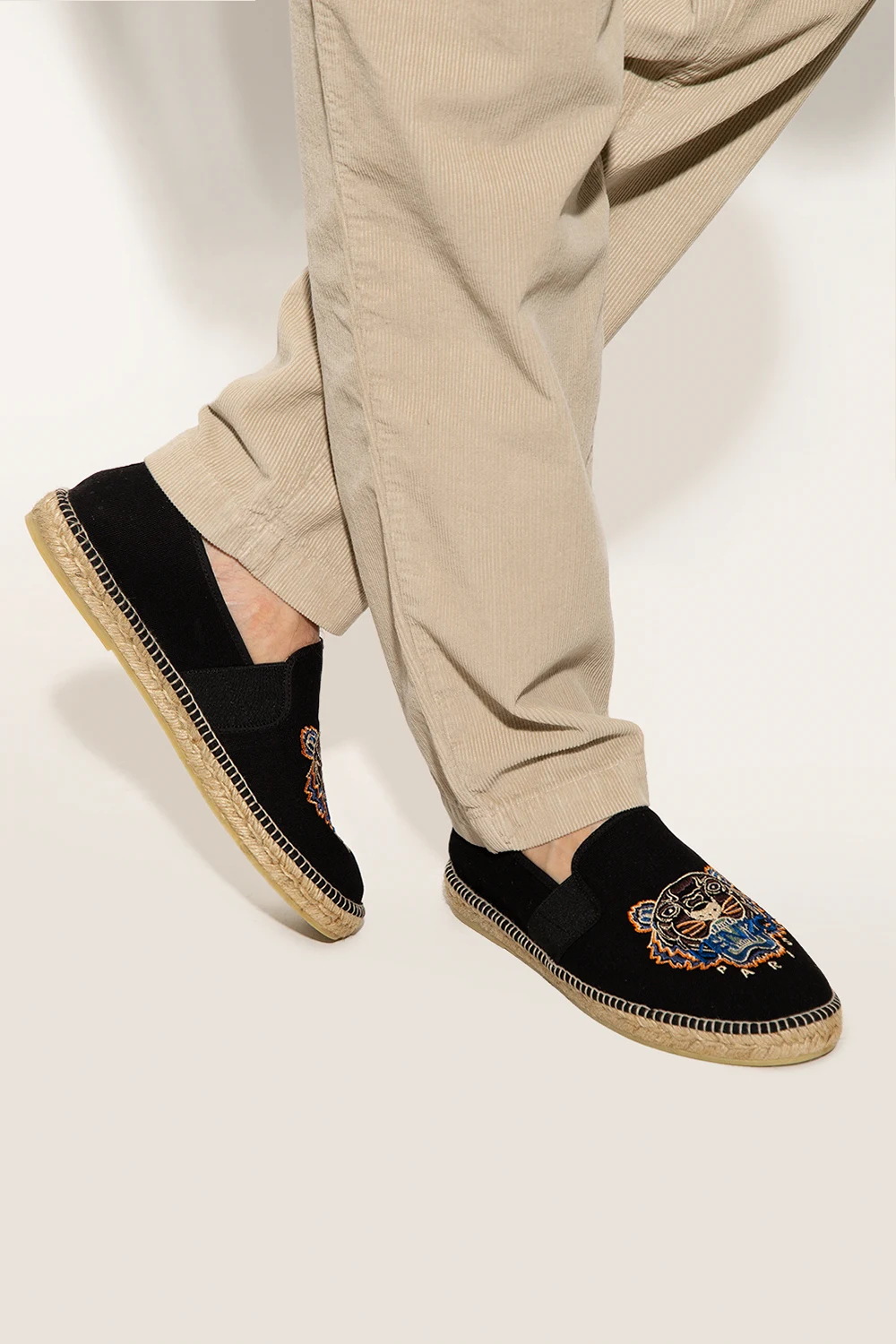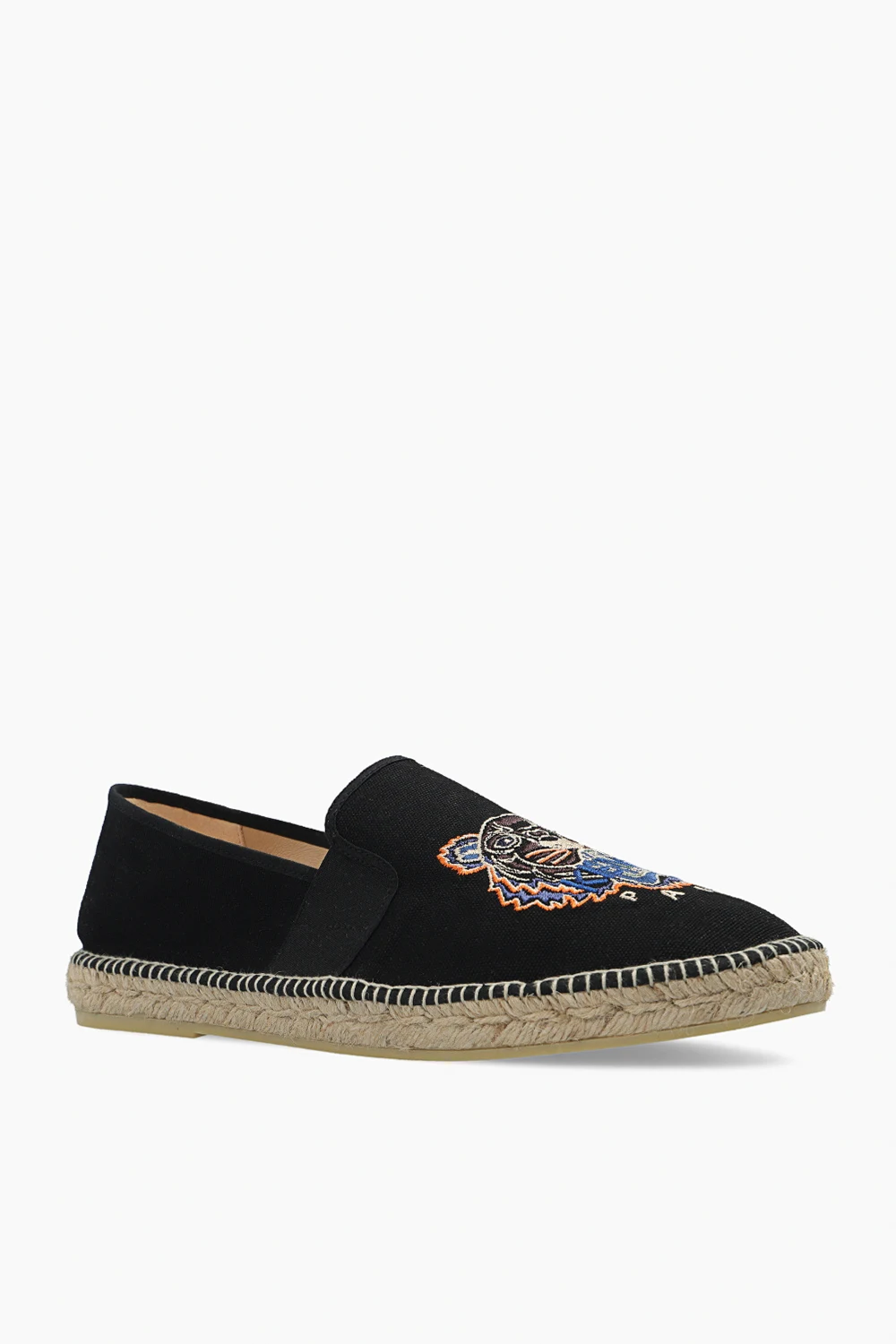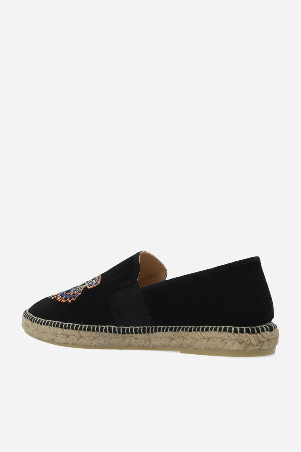 Black espadrilles from Kenzo. Crafted from canvas, this model sits on a beige rubber and jute sole and showcases colourful graphic embroidery with the brand's signature tiger and logo.