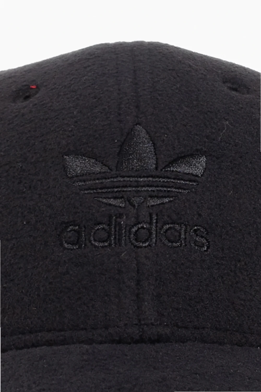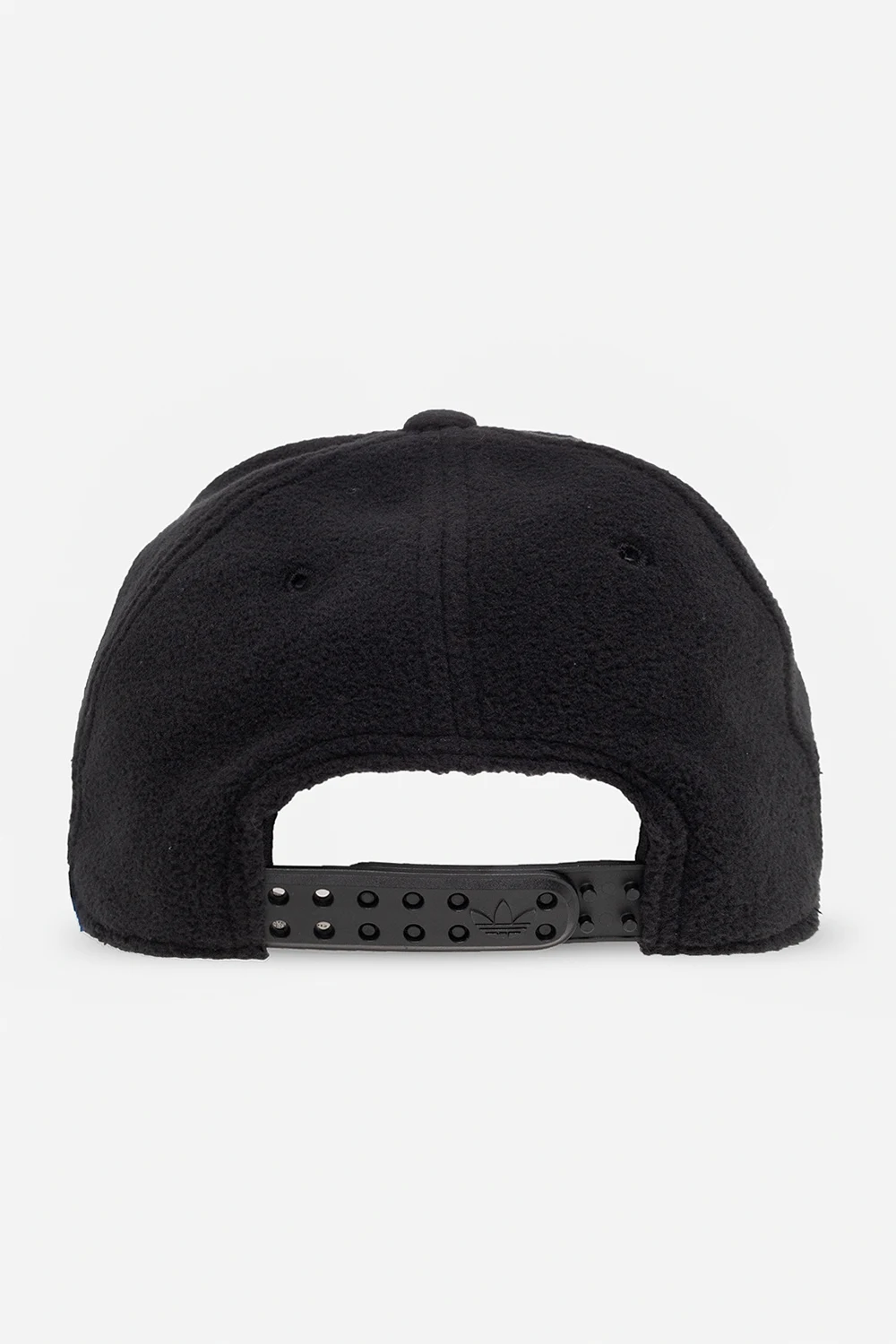 Black ribbed baseball cap from ADIDAS Originals. Crafted from recycled materials, this item features a logo patch and adjustable buckle strap at the back.