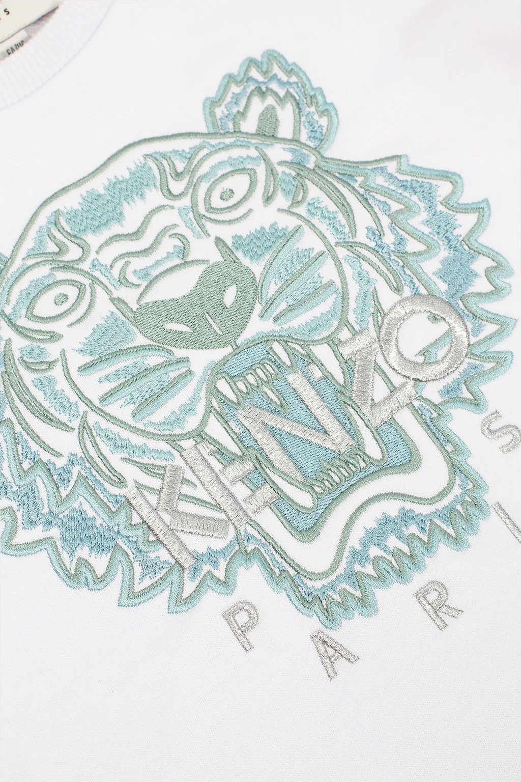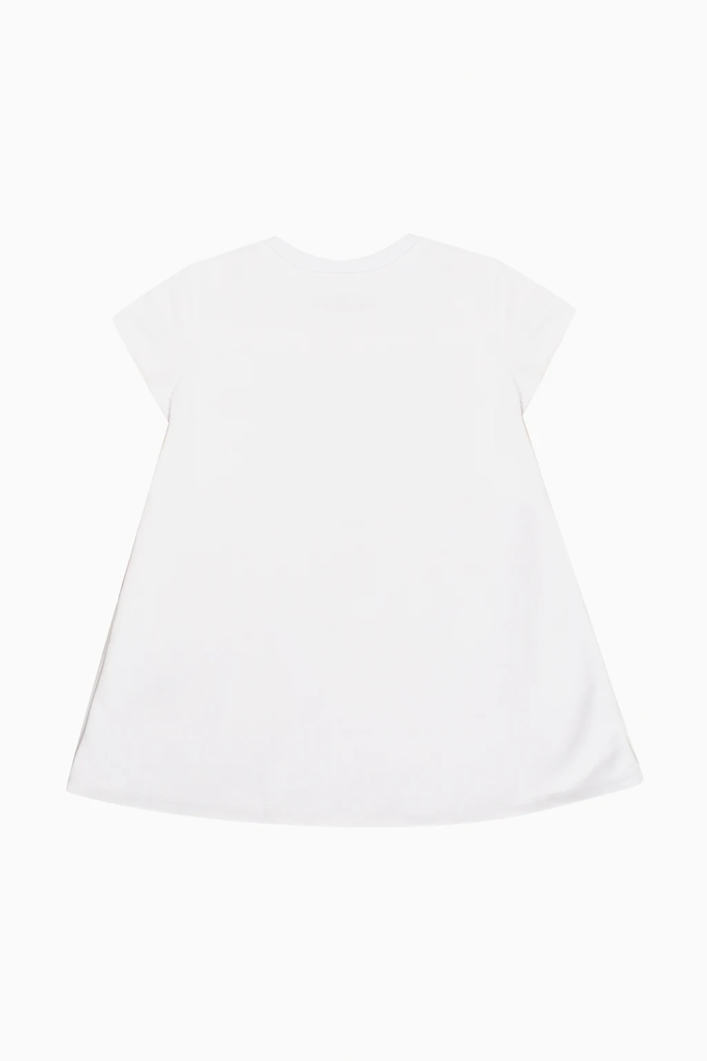 White dress from Kenzo. This short sleeve design features side pockets, a round neck and the brand’s signature multicolored tiger head.