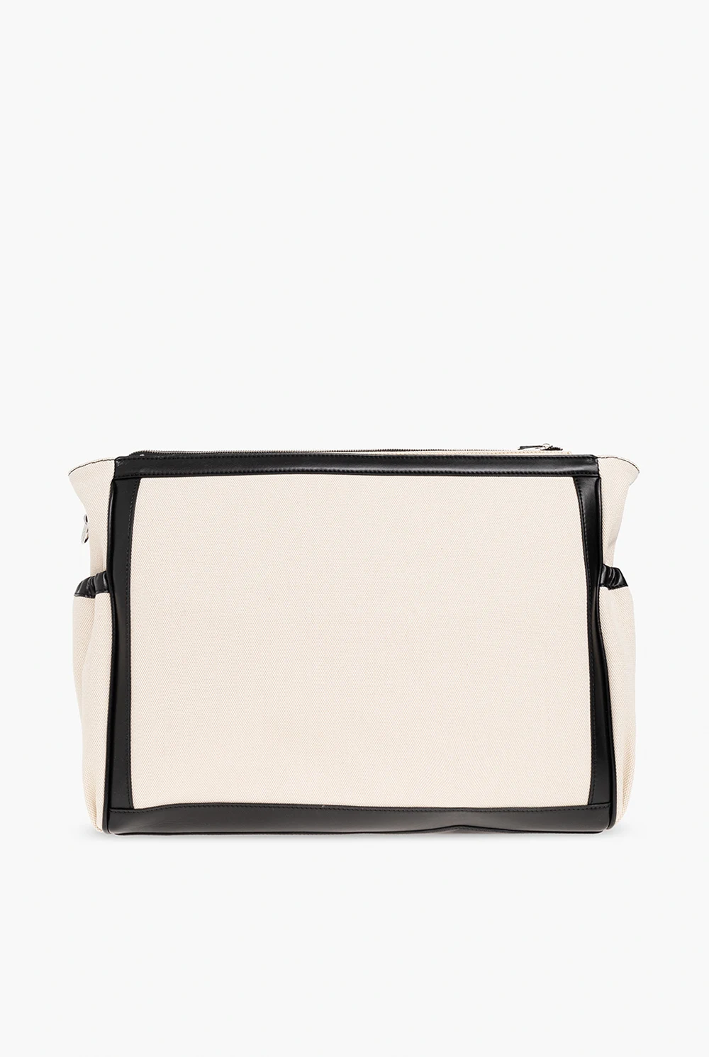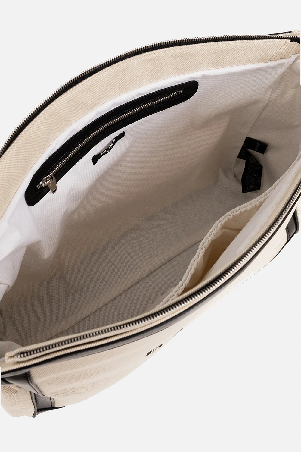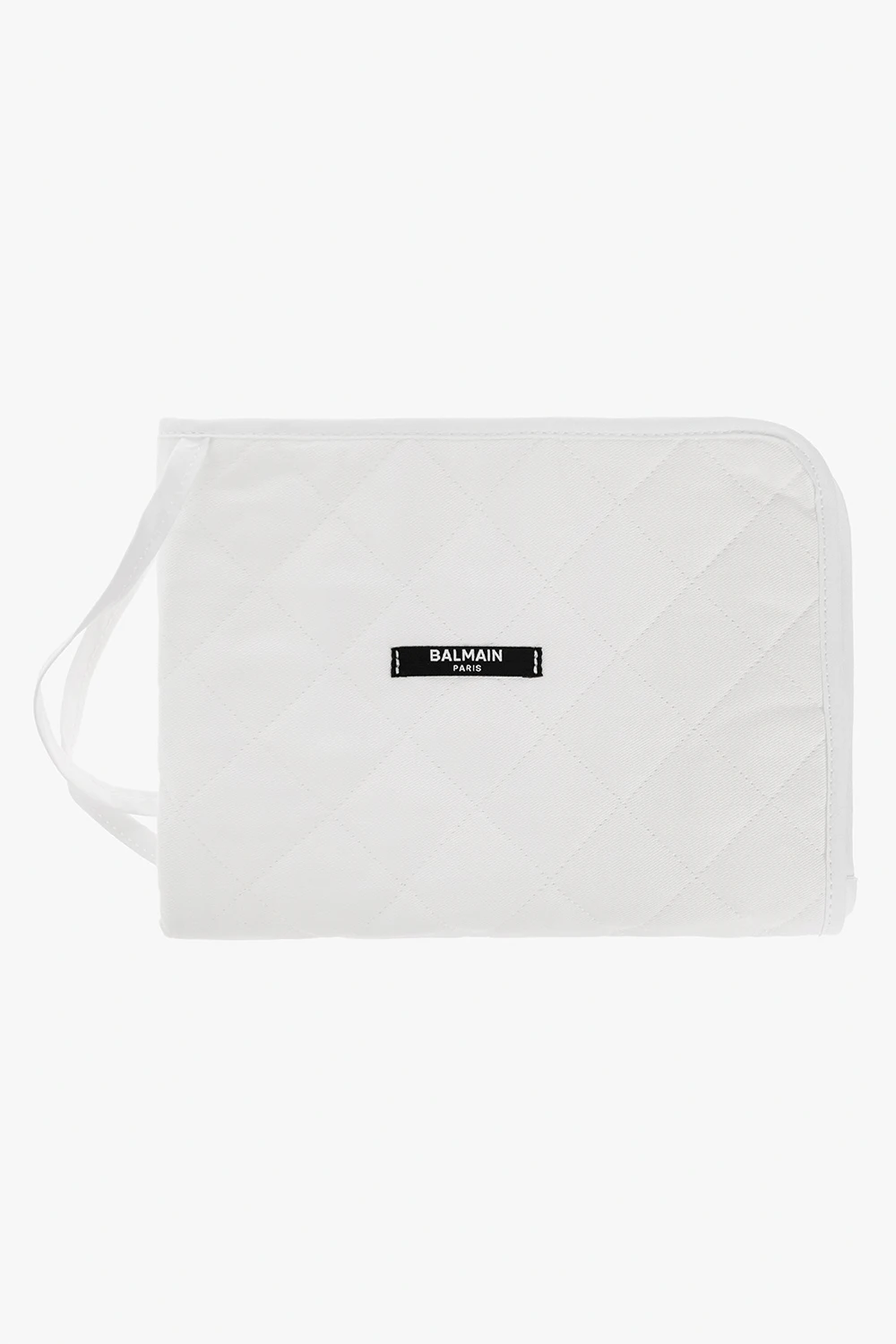 Cream changing bag from Balmain Kids. Made of canvas trimmed with black leather, this model is complete with a zip fastening, logo print, side pockets, detachable and adjustable shoulder strap and silver-tone metal hardware. It has one internal compartment with one slip pocket and one zip pocket. Comes with a quilted changing mat.