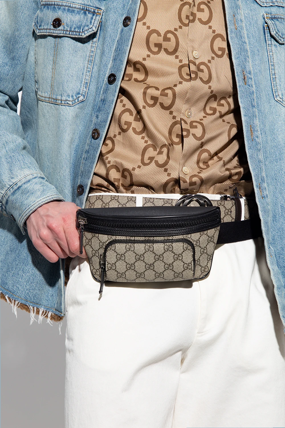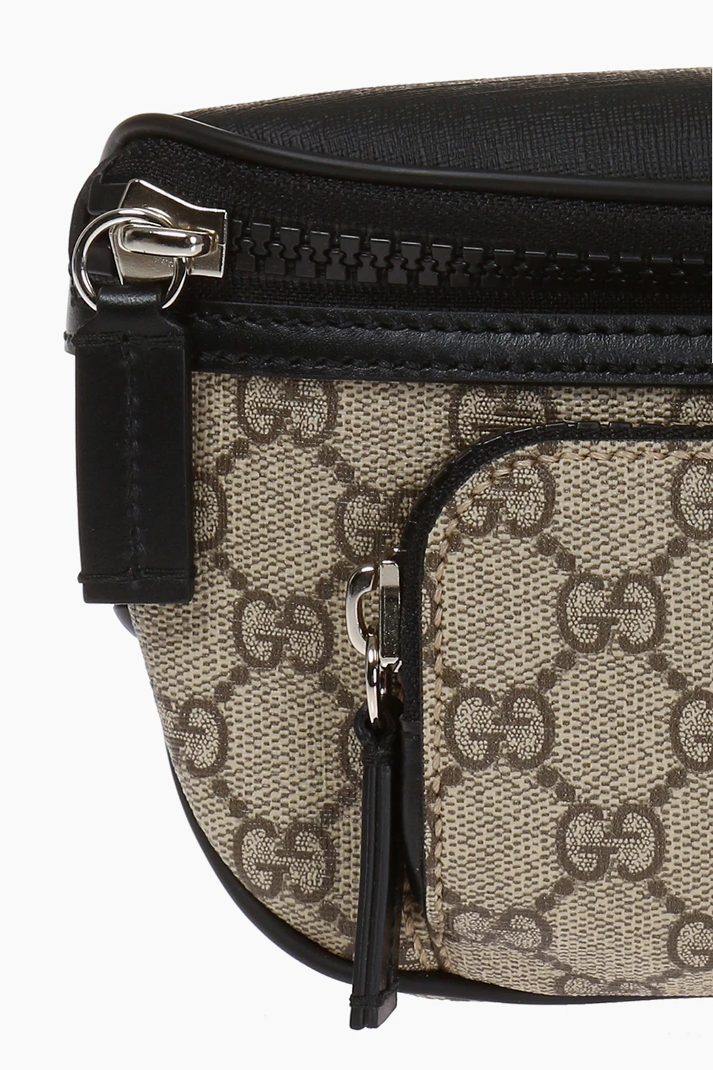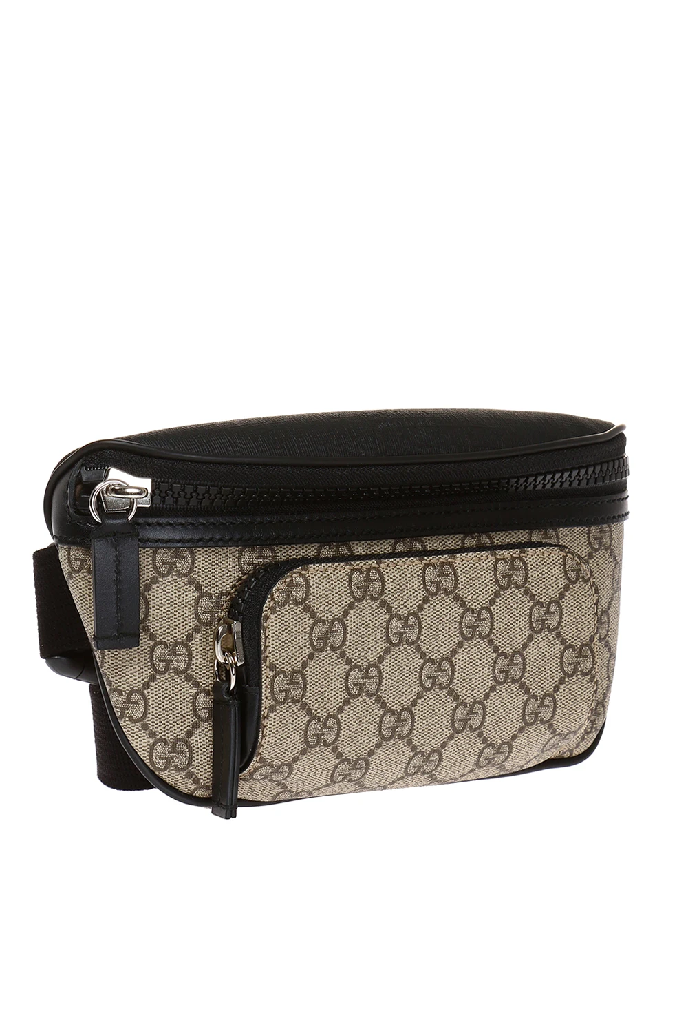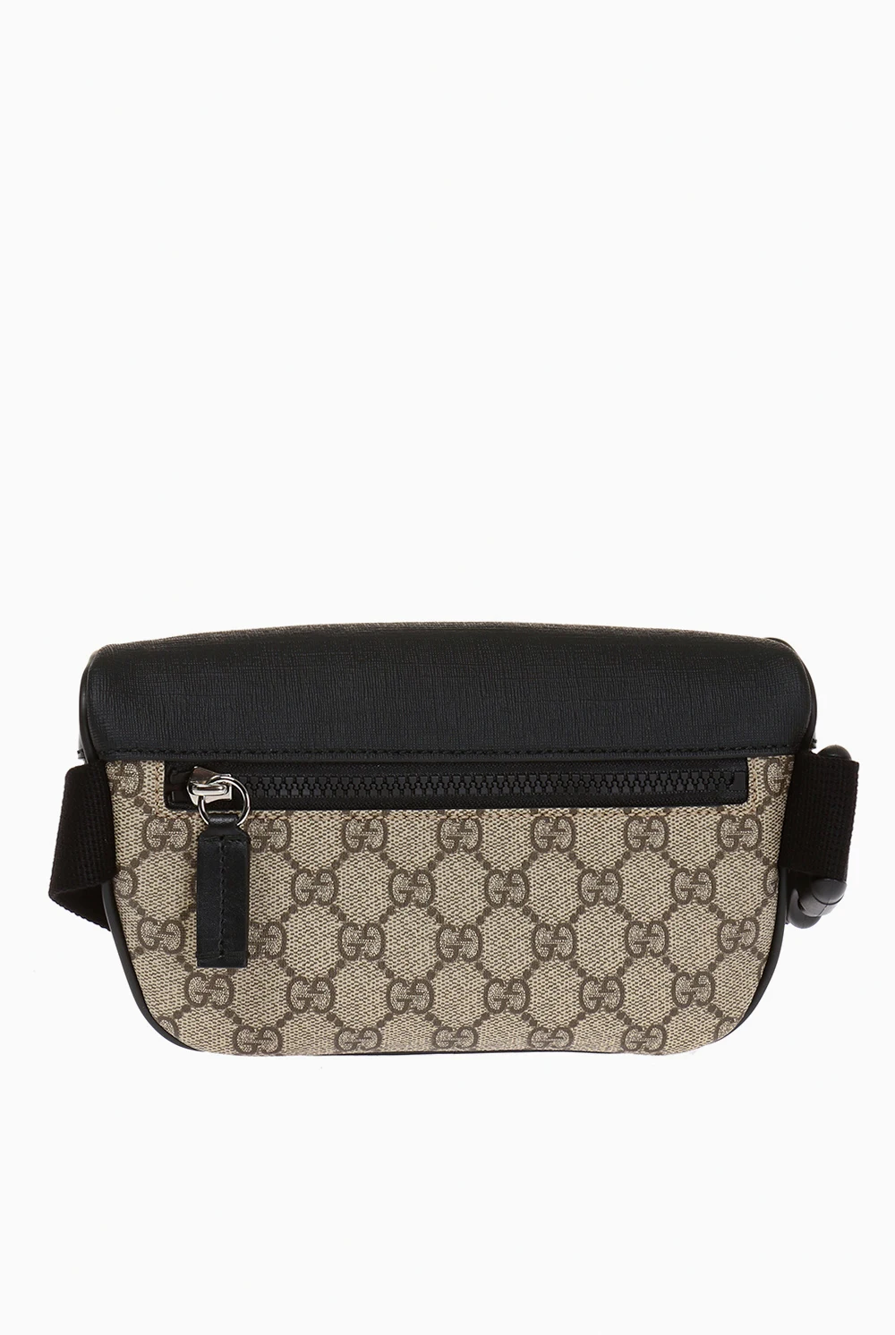 Beige and black belt bag from Gucci. Crafted from GG Supreme canvas with leather trims, this item features a zip fastening, printed logo pattern, zip pocket on the front, adjustable belt and silver-tone metal hardware.