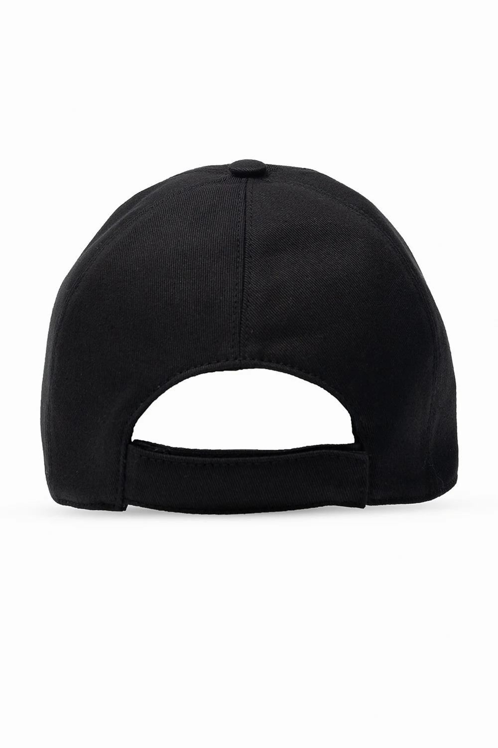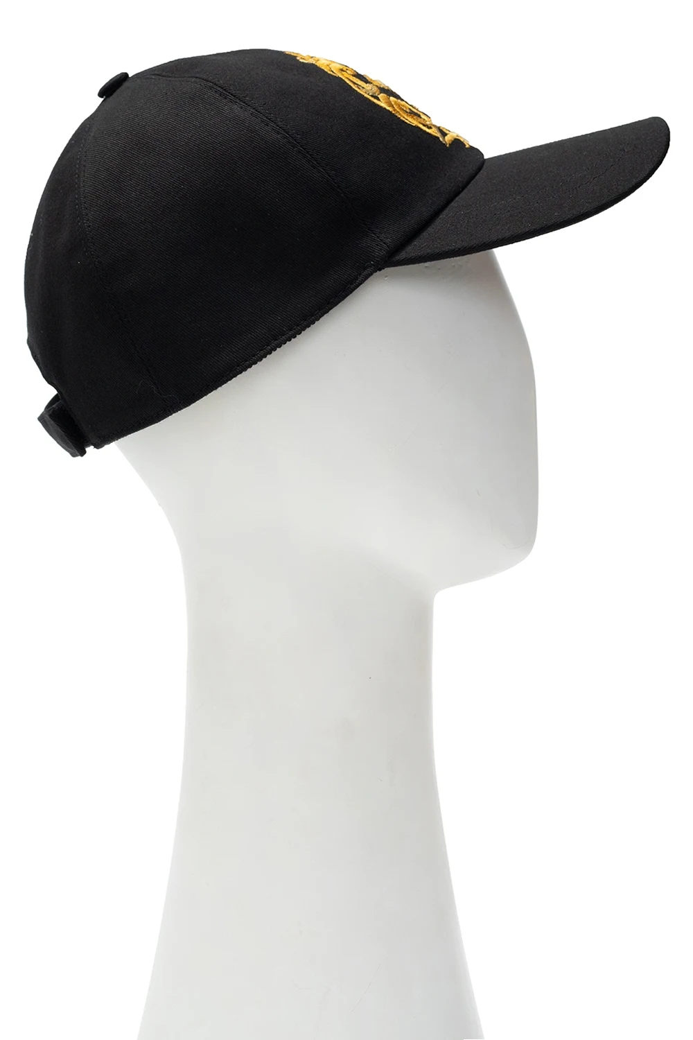 Black baseball cap from Versace. Cut from cotton, this piece of headwear secures via velcro strap on the back and showcases embroidered iconic Medusa head.