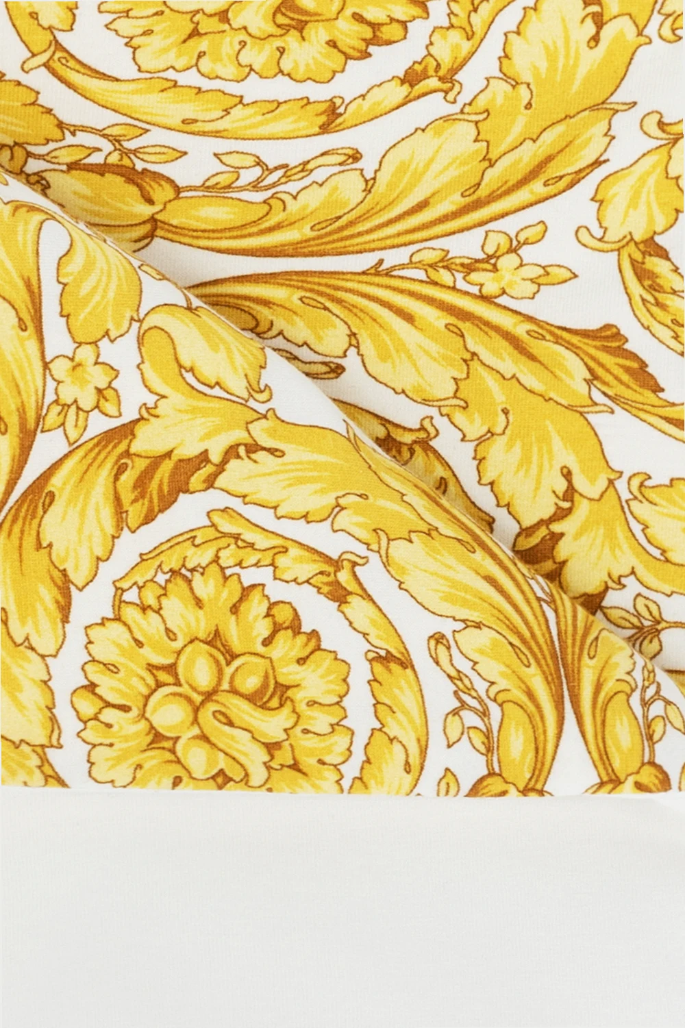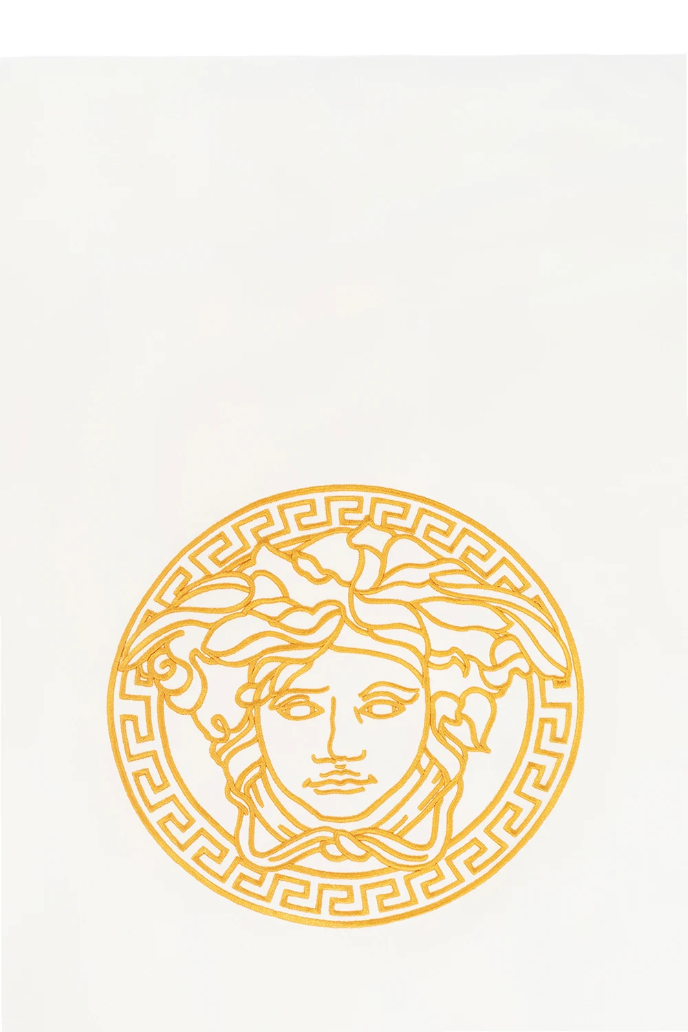 White blanket from Versace Kid. Made of cotton, this garment features a yellow Medusa head embroidery and the label’s signature Barocco print in yellow and brown.