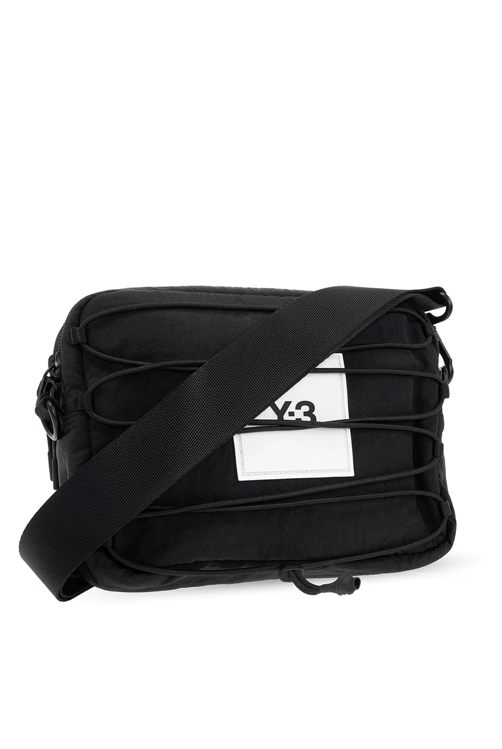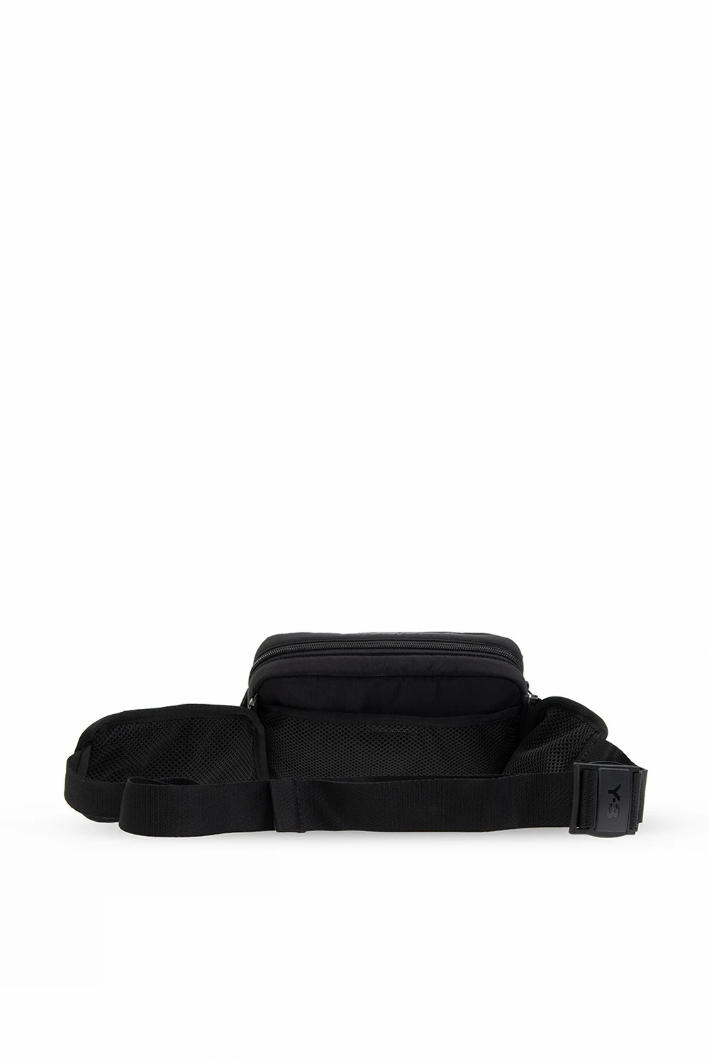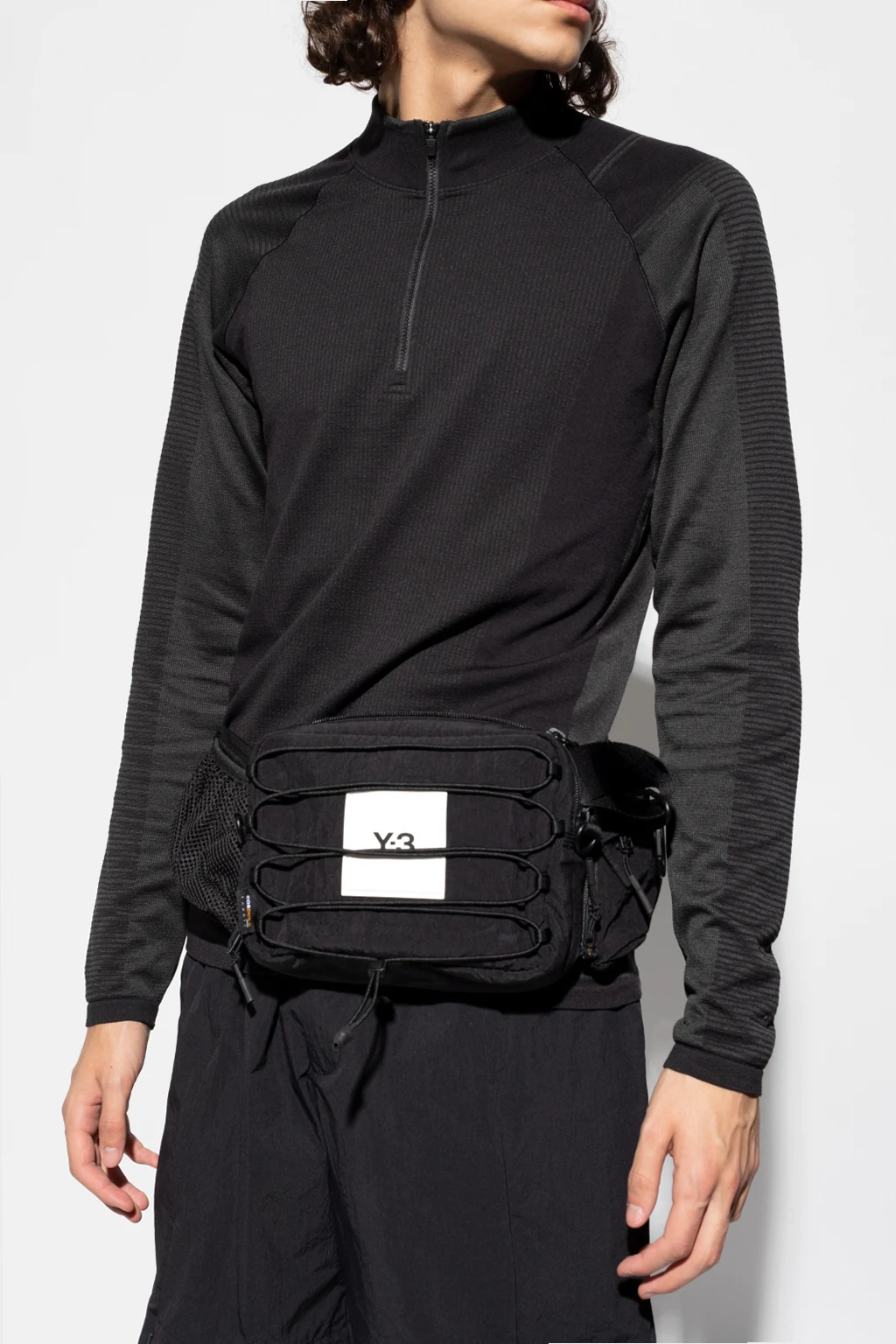 Black belt bag from Y-3 Yohji Yamamoto. Crafted from Cordura®- a fabric recognized for its long-lasting durability and resistance to abrasions and tears, this design fastens via a zip and features a white logo detail and drawstrings on the front, a velcro-fastened pocket on back, a detachable and adjustable waist strap and one internal compartment with a zip pocket. The item comes with a strap to wear it crossbody.