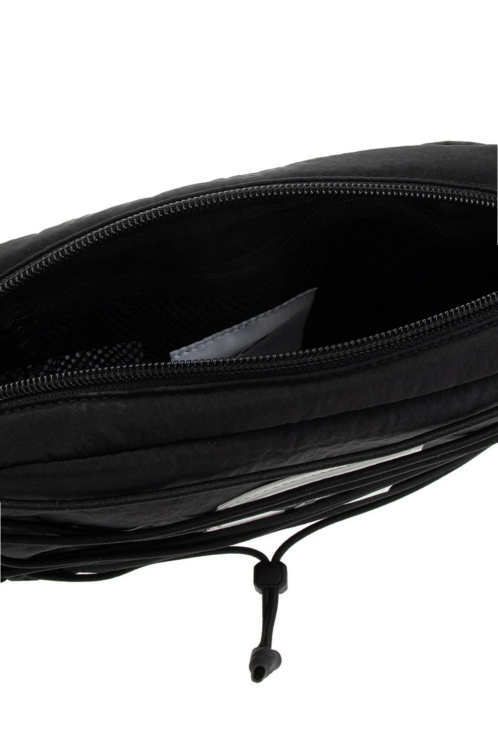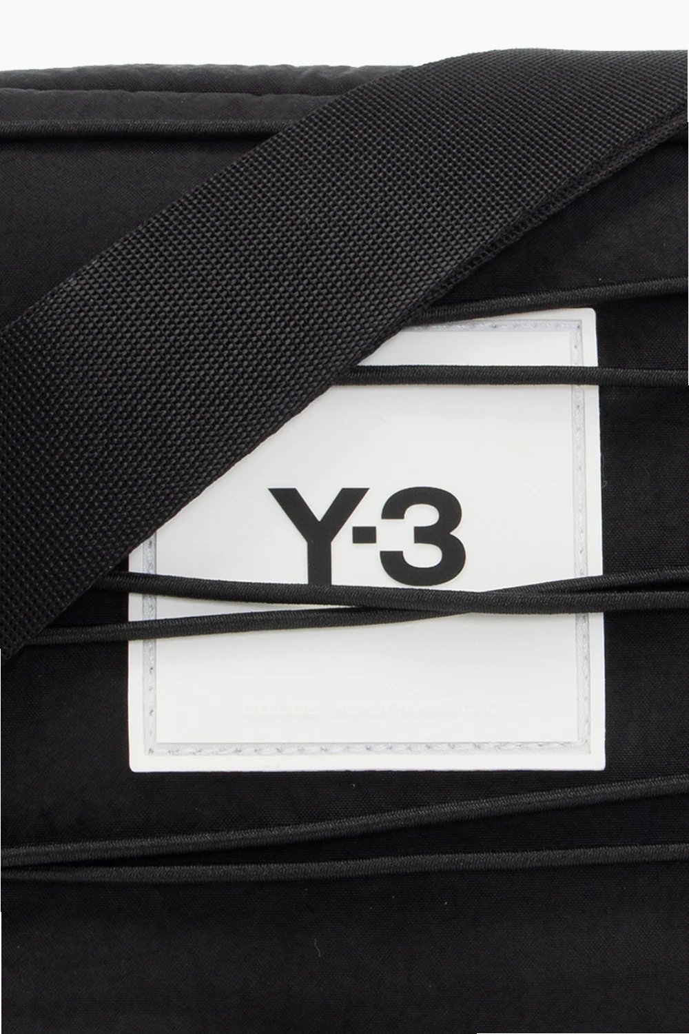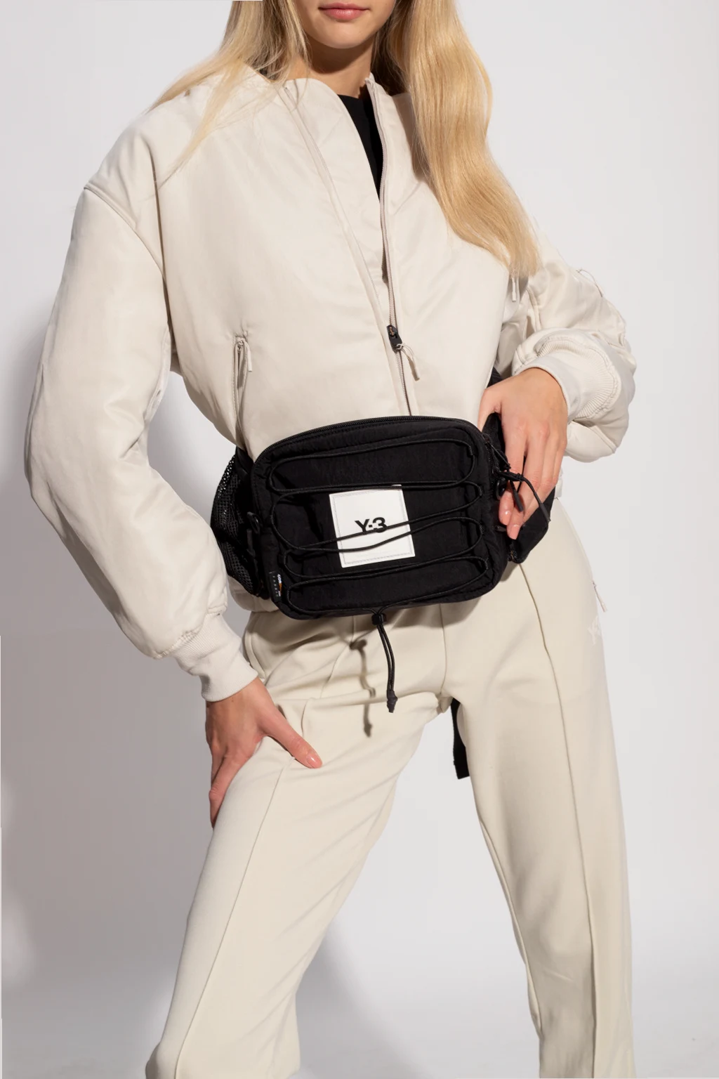 Black belt bag from Y-3 Yohji Yamamoto. Crafted from Cordura®- a fabric recognized for its long-lasting durability and resistance to abrasions and tears, this design fastens via a zip and features a white logo detail and drawstrings on the front, a velcro-fastened pocket on back, a detachable and adjustable waist strap and one internal compartment with a zip pocket. The item comes with a strap to wear it crossbody.