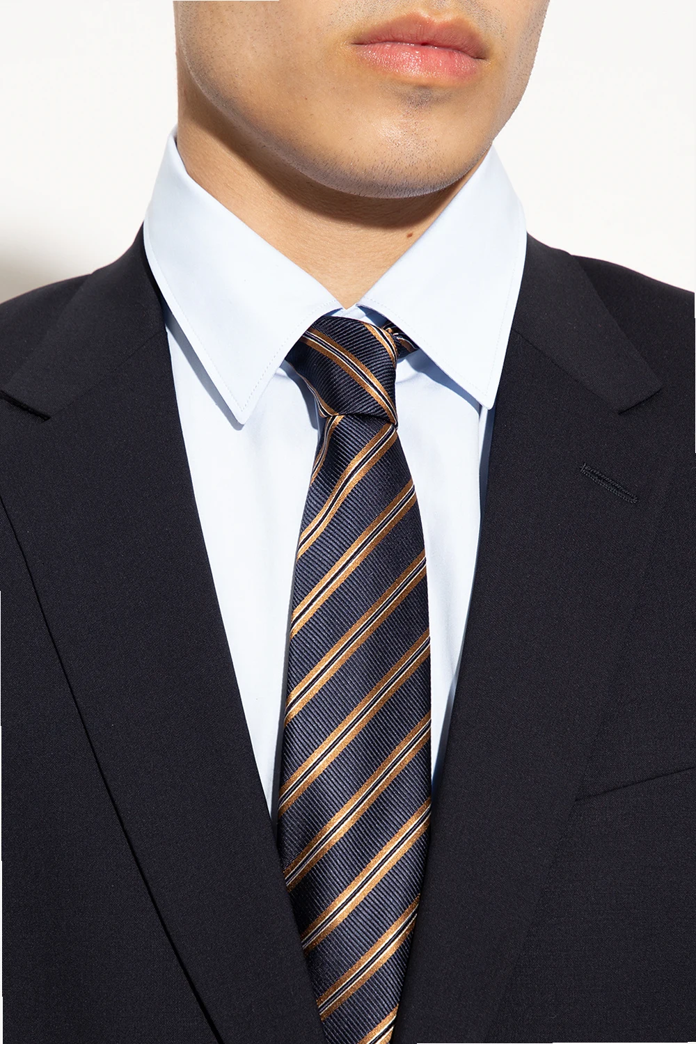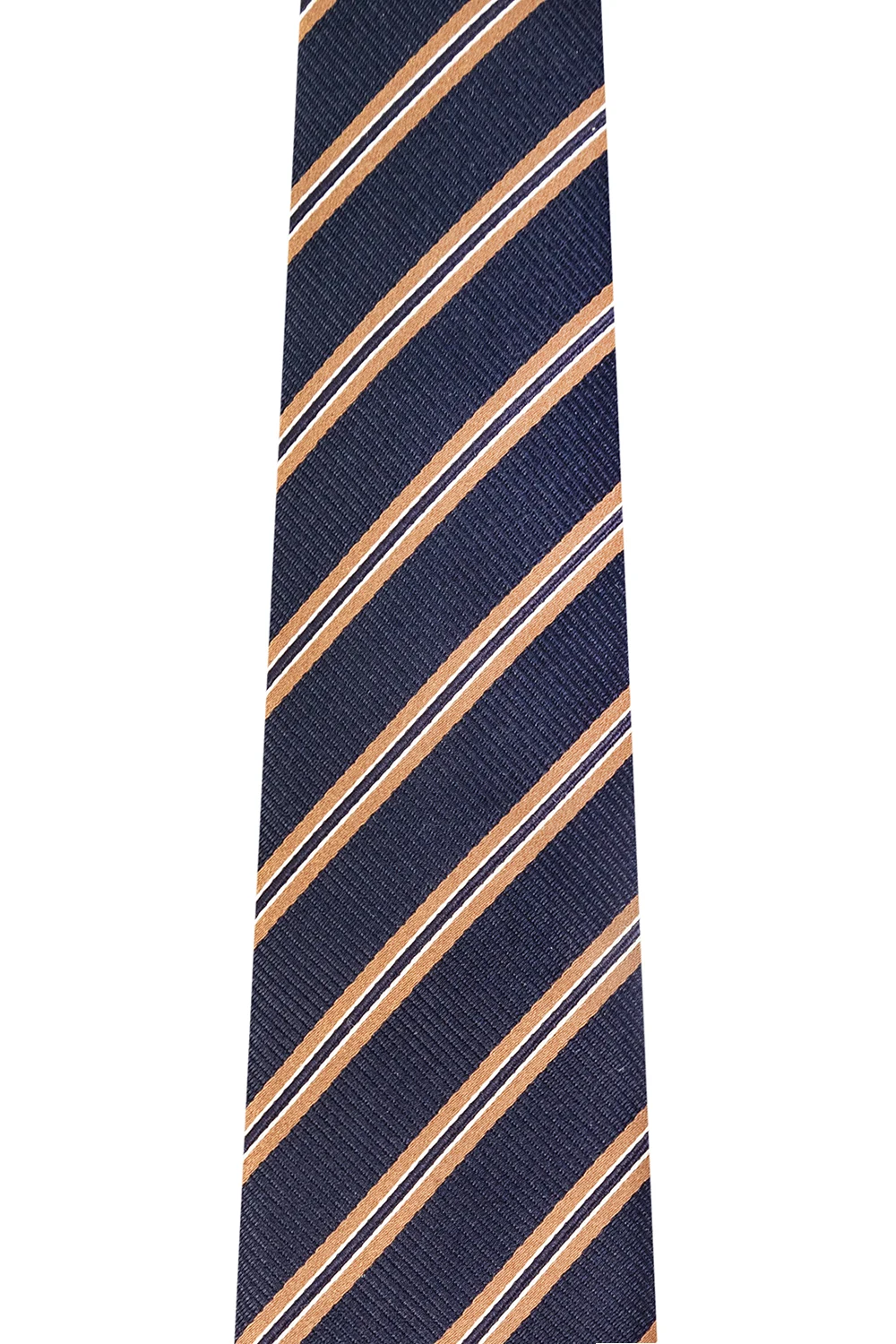 Navy blue tie from Giorgio Armani. Crafted from a silk and cotton blend, this item showcases beige, navy blue and white stripes.