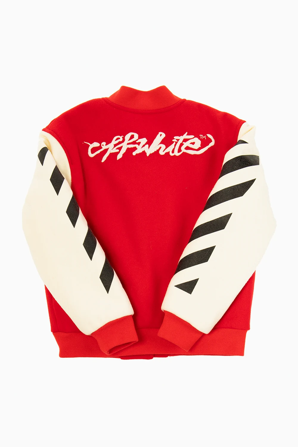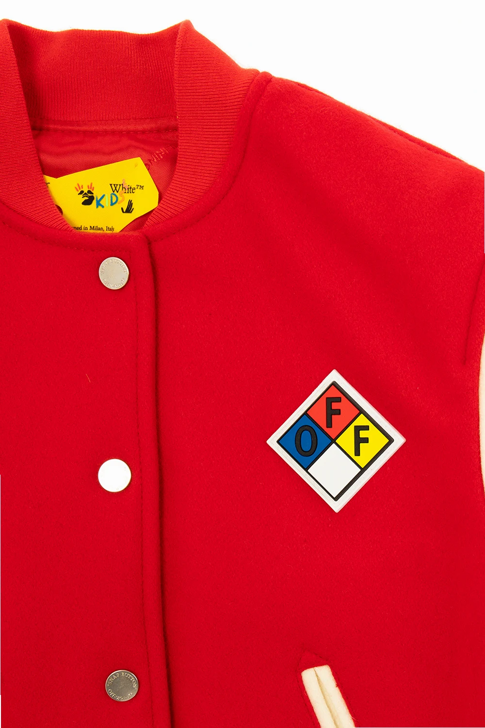 Red and white bomber jacket from Off-White Kids. Made of wool, this garment features snap fastenings, two slip pockets, multicolored logo appliqué, white logo embroidered at the back and ribbed trims at the collar, hem and cuffs.
