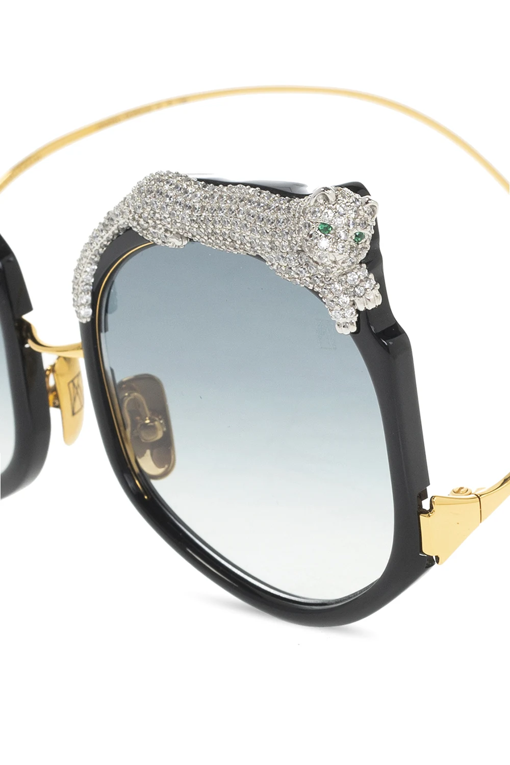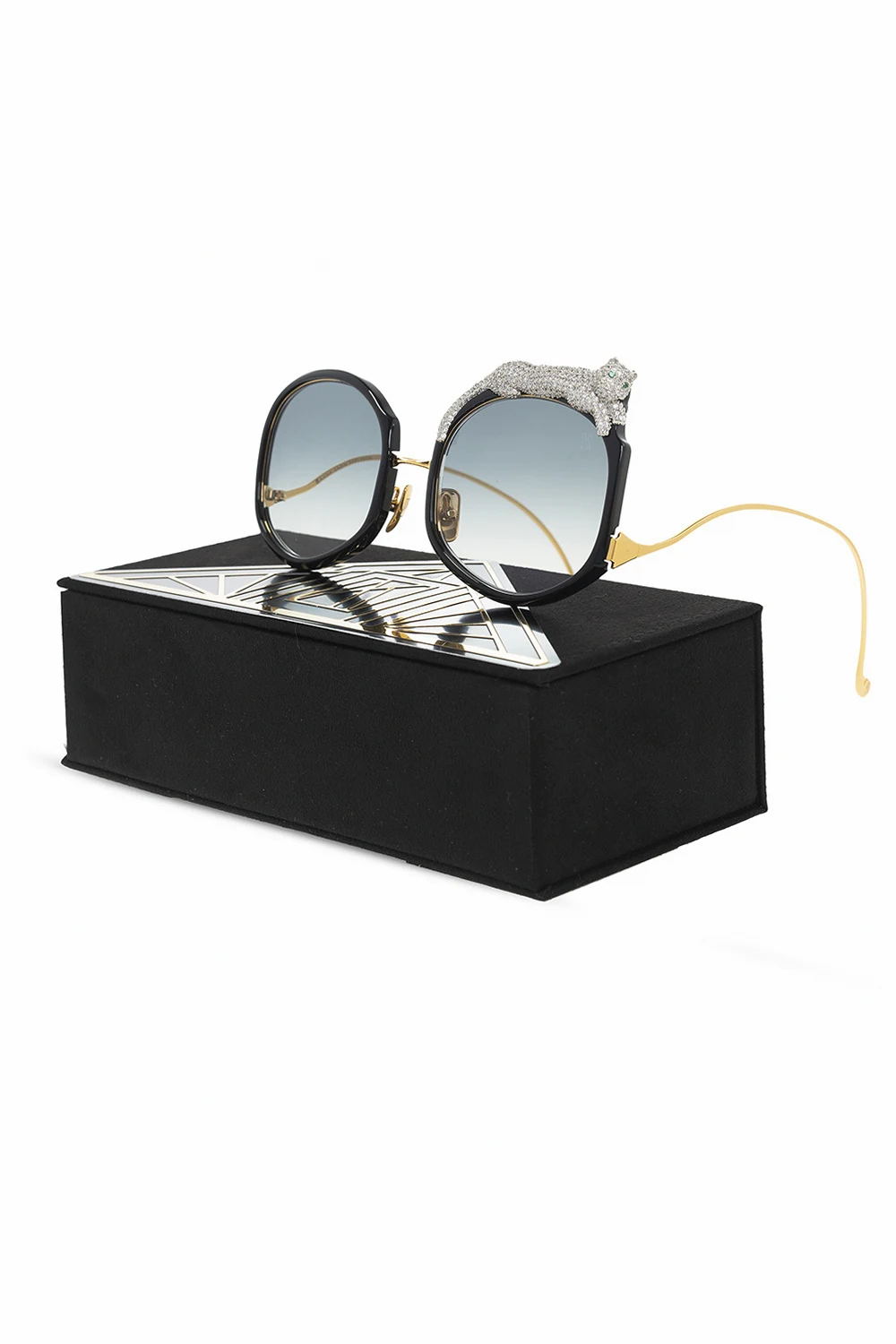 Black and gold-tone ‘Rose Et Le Reve’ sunglasses from Anna Karin Karlsson. Limited edition. Handcrafted in Japan and Italy, this pair comes in a case and is adorned with Swarovski crystals and a distinctive silver-tone appliqué. It features grey Carl ZEISS lenses with azure back coating. There have been produced only 20-100 pieces worldwide. An authenticity card is provided with each frame and they are individually numbered