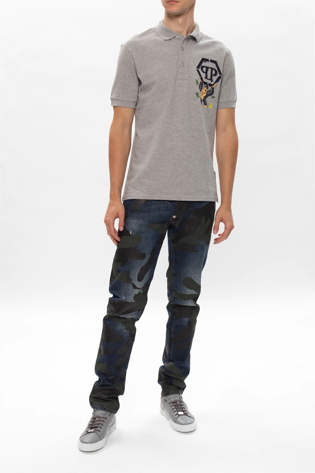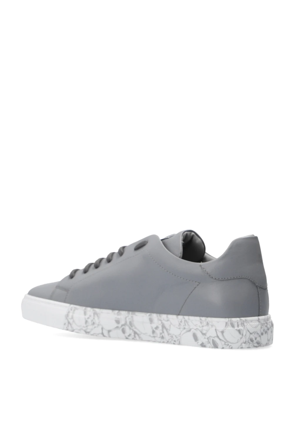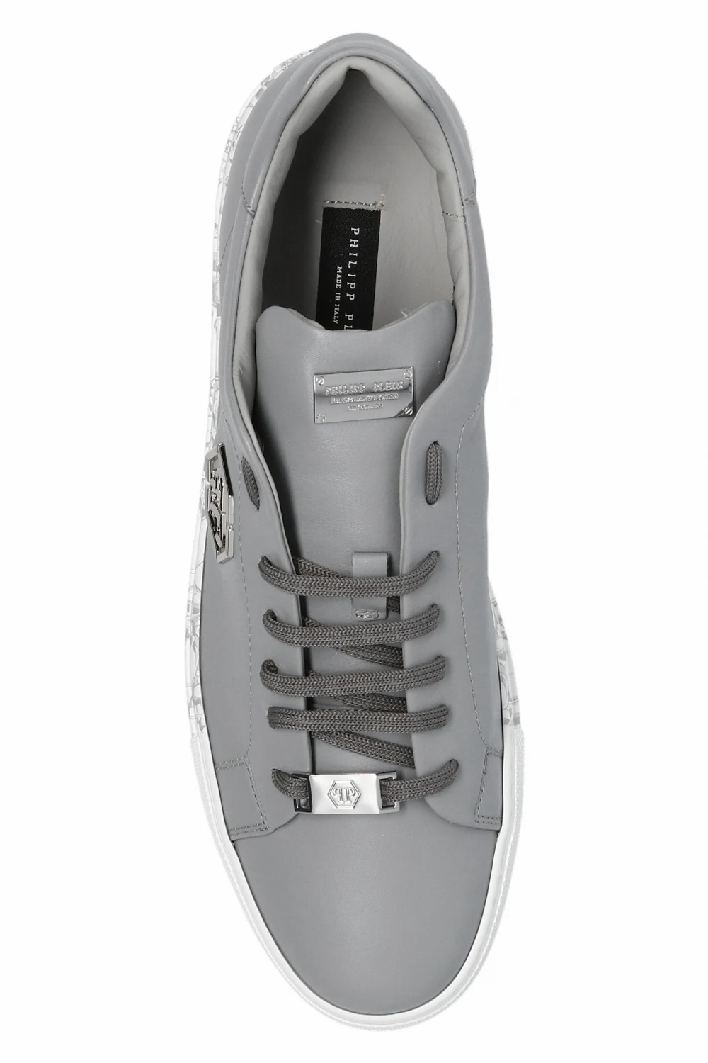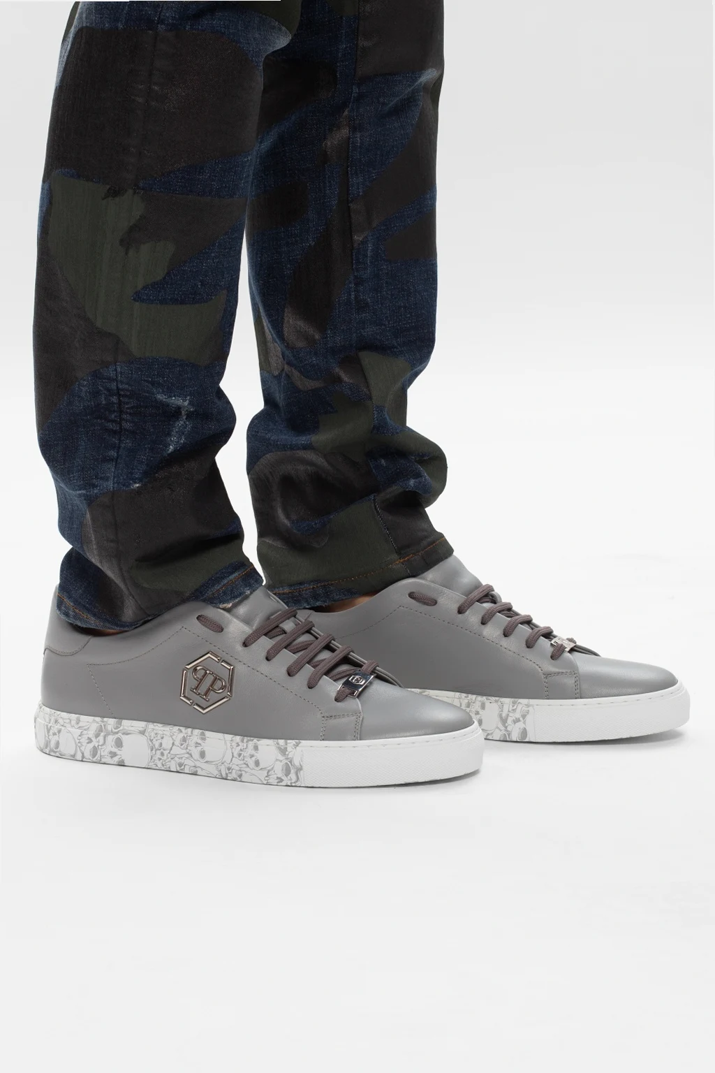 Grey 'Hexagon and Skull' sneakers from Philipp Plein. Crafted from grain cow leather, this lace-up pair was set on a white rubber sole and emblazoned with silver-tone metal logo plaques and the printed grey skull, a motif signature for the designer.