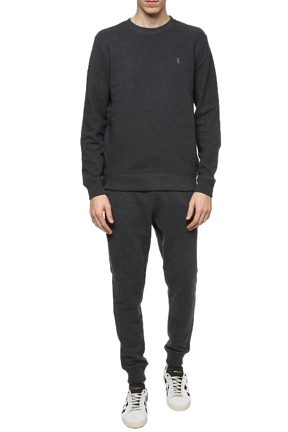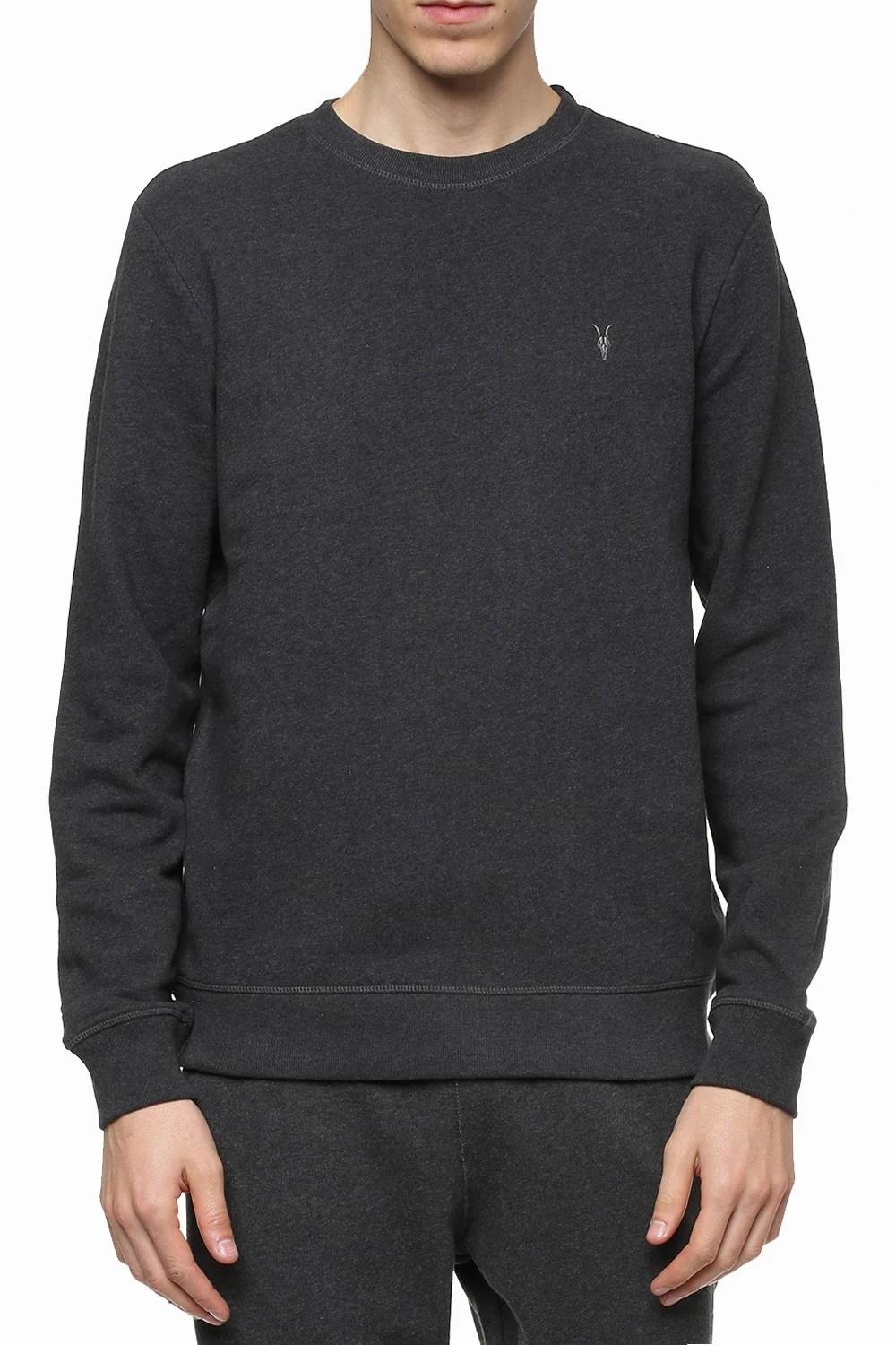 Grey cotton 'Raven' sweatshirt from AllSaints. Elasticated hem and cuffs. Embroidered logo. Round neck.