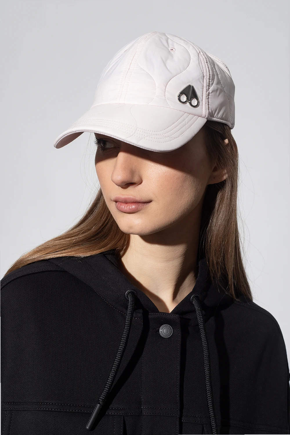 Pink quilted baseball cap from Moose Knuckles. Made of recycled fabric, this model features a silver-tone logo appliqué, snap-fastened elastic strap at the back and decorative cut-out details.